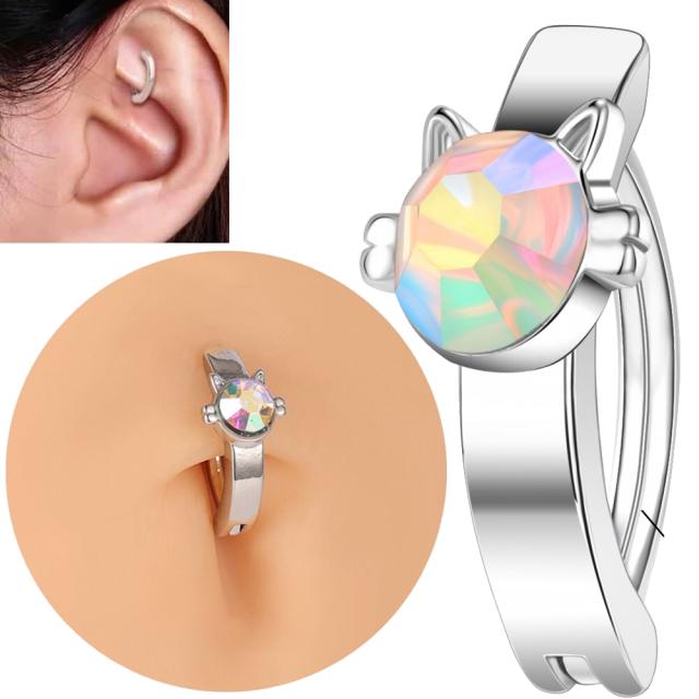 [14G 楕円形 フープピアス型 ボディピアス] レインボーキャット・ネイブル・ロッククリッカー 14ゲージ ボディーピアス 1個販売 ステンレス 銀色 シルバー ルーク 男性 女性 彼氏 彼女 ワンタッチ リングピアス ストーン 石付き ジュエル 猫 ねこ アニマル 動物 虹色