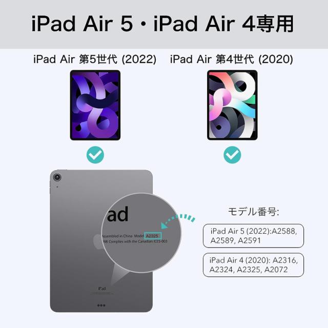 | iPad ケース | 【対応機種】 10.9インチのiPad Air 第5世代 (2022)・iPad Air 第4世代 (2020)専用のiPadケースです。モデル番号: A2588, A2589, A2591, A2316, A2324, A2325, A2072。その他のどのiPadのモデルにも対応していません。Touch IDに関しては、ケースをつける前に指紋を登録してください。 【取り外し可能なカバー】 マグネットカバーをつけるとスクリーンを保護でき、折り畳むと視聴/入力/縦置きモードで使うことができます。またゲームをする時にカバーを取り外すと快適です。 【しっかり保護】 丈夫で衝撃に強いポリマーにより、傷や落下からしっかり保護することができます。 【安定感があり調節可能なスタンド】 しっかり磁気吸着し、8つのスタンドポジションに対応しており、ベッドでもソファでもきちんと安定します。 【自分に合った方法で】 目線に近い高さにしたり、縦置きしたり、磁石で冷蔵庫に引っ付けたりでき、オフィスやキッチンでiPadを快適に使うことができます。 |