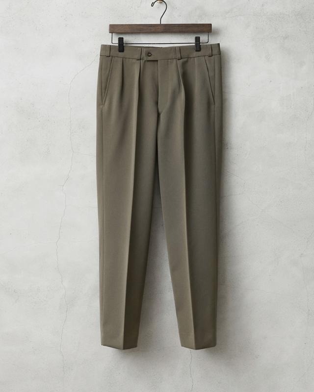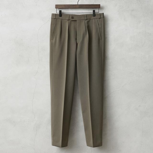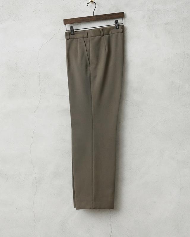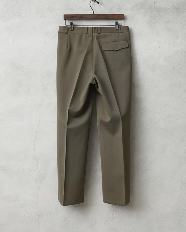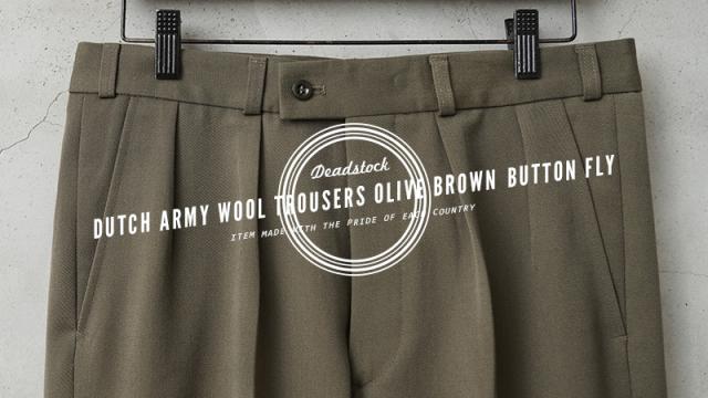 オランダ軍で採用されている上質なツータックトラウザーズが入荷しました。1990年代をメインに様々な年代のアイテムが入荷しており、オリーブとブラウンの中間色といった感じの絶妙なカラーが特徴です。ウエストはツータック仕様で腰回りは適度なゆとりがあり、ストレートシルエットで、スラックスとしては標準的な太さで動きやすく、着用時には綺麗なセンタークリースが入ることで、縦にまっすぐ伸びたラインが強調され、上品さが際立つ綺麗なシルエットに仕上がっています。