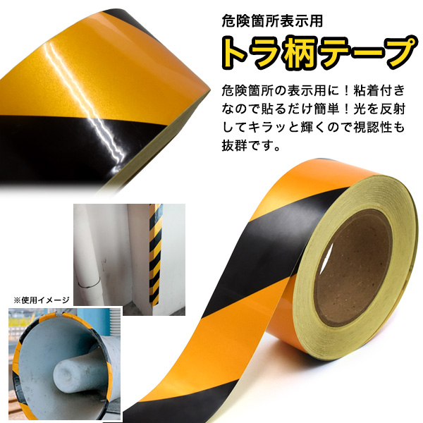 ラインテープ 黄/黒 トラ柄テープ 50m 危険箇所表示 ガードテープ 光を反射 視認 安全 テープ 危険表示 施設 店舗 事務所 工場 安全用品 駐車場 ガレージ 資材 虎テープ 衝突防止用 ご自宅 お店 工事現場 ガレージ パーキング 駐輪場 禁止ライン