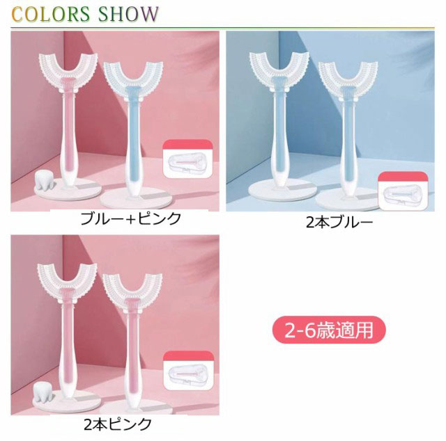 | かわいいデザインが子供の歯磨く意欲を上げる歯ブラシセット 素敵なU字型のデザイン、子供たちは彼らが良い習慣を開発するのに役立ち、それを愛するでしょう。 U字型の子供用歯ブラシは子供に適切に歯を磨き、健康な口を作る方法を教えるのに間違いなく役立ちます! 歯の中の届きにくい部位を有効に清潔にすることができます。45度のブラッシングでお子さまの歯にキズがないように安心して、お手入れできます♪ 食品グレードのシリコーンとPP素材で、無臭で有害な成分を含まない適切な柔らかい素材です、子供をしっかり守れます。 赤ちゃんの歯みがきは、最終的に自分で歯を磨く習慣をつけさせることが目標です。いずれは自分で歯みがきを行えるよう、握りやすく扱いやすい形状の歯ブラシを選んであげましょう。 ◆滅菌後に再利用できます、お財布にも地球にも優しい。 | |