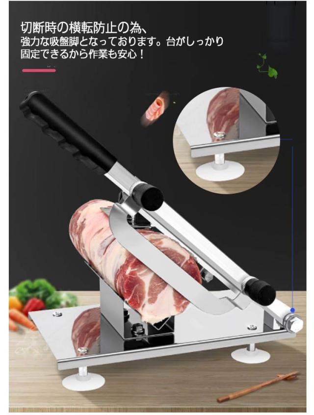 | 手動式ミートスライサー。生ハムをはじめ、ベーコン・しゃぶしゃぶ肉・チャーシュー・すき焼き肉・ソーセージ・ローストビーフ・焼肉・ブロック肉・野菜・パンなどさまざまな食材から冷凍食品までスライスできる。 冷凍肉も切断可能!スライスが苦手という方でもコツいらず固い冷凍肉も簡単に食品をスライスできます。 厚みが選べる!スライスできるサイズは0.3〜8mmと食材に合わせて厚みを変えていただけます。 刃部分はステンレス鋼を使っているので、肉を切る際の摩擦で有害成分が混ざることがない安心仕様! スプリング付きで自動かつ安全に肉を移動できます。食材を押さえるパーツにはトゲがついているので、がっちり固定できて滑りにくいです。 切断時の横転防止の為、強力な吸盤脚となっております。台がしっかり固定できるから作業も安心! ステンレス素材のため錆びにくく、シンプルな設計により丸洗いが可能です。 | |