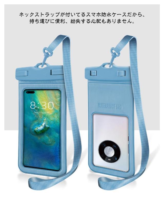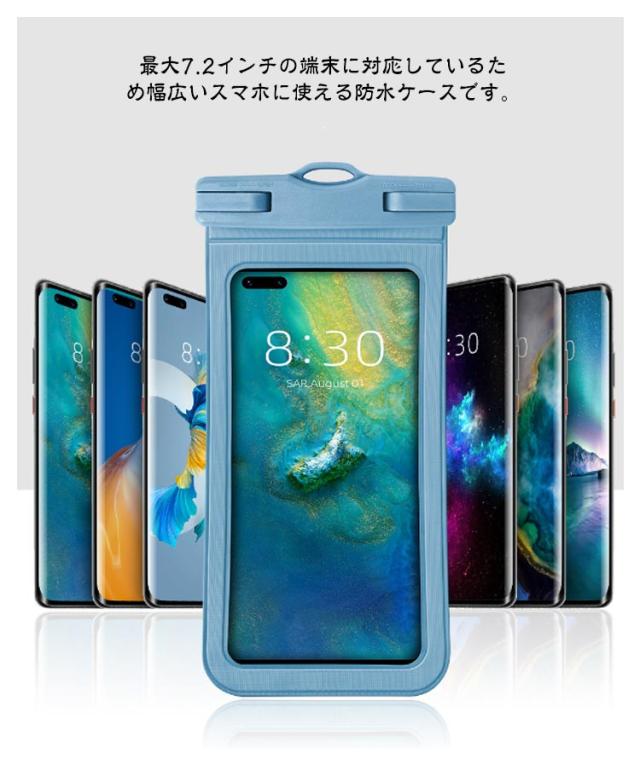 | お風呂や海、プールなどでスマホを使いたいときに便利なのがスマホ防水ケース。 IPX8等級の商品は一定の水深に一定時間沈めていても内部に浸水しません。 水没しても安心!空気層があり水に浮かびます。 スーパークリアコーティングでより鮮明な写真写り! 画面操作、写真撮影などケースに入れたまま操作ができます。 7.2インチまでのスマートフォンに対応可能、幅広い機種でお使い頂けます。 ワンタッチで簡単に開閉可能なので、お子様からご年配の方まで手軽に使用可能です。 | |