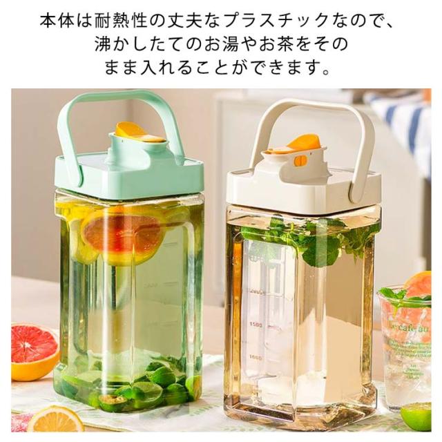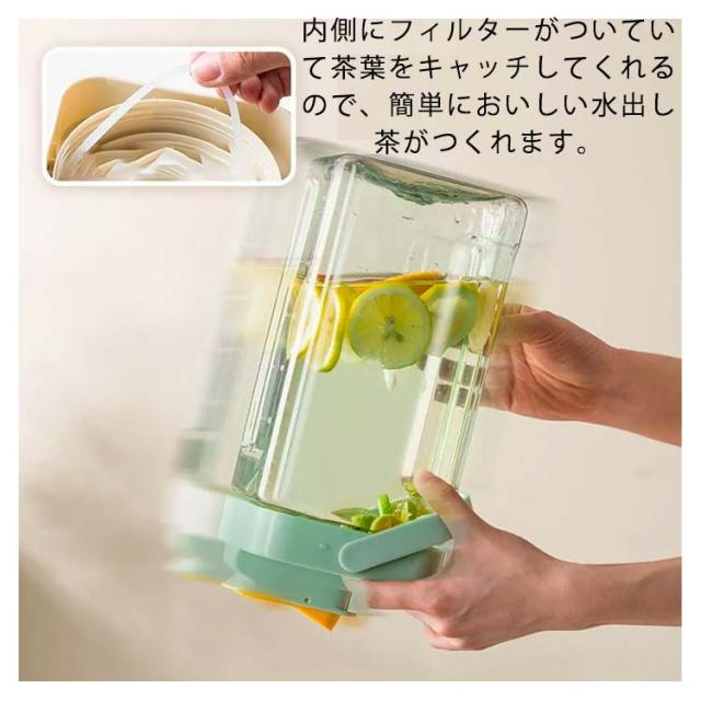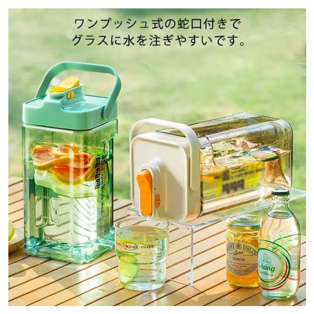| 大容量3.5L /お湯も注げる/横置き可能/完全密閉/蛇口付き冷水筒 パッキン付きなので密閉性が高く、冷蔵庫の棚にヨコ置きで収納ができます。 ワンプッシュ式の蛇口付きでグラスに水を注ぎやすいです。 開口部分は広口設計なので、底まで手を入れて隅々までしっかり洗えます。また、全てのパーツが分解できて丸洗いできるので衛生的です。 内側にフィルターがついていて茶葉をキャッチしてくれるので、簡単においしい水出し茶がつくれます。 本体は耐熱性の丈夫なプラスチックなので、沸かしたてのお湯やお茶をそのまま入れることができます。 密閉性に優れ、ハンドル付きで持ち運びしやすいのでアウトドアシーンにも活躍します。 | |