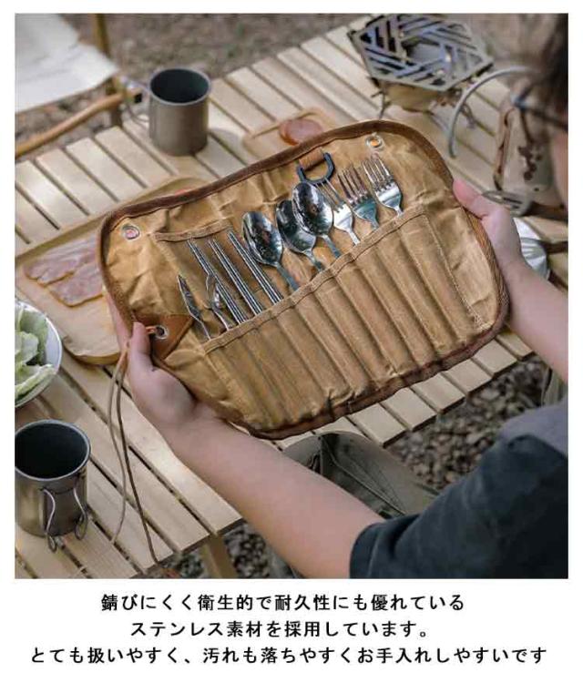 | キャンプやピクニック、バーベキュー等で大活躍のステンレス製のカトラリーセットです 錆びにくく衛生的で耐久性にも優れているステンレス素材を採用しています。 とても扱いやすく、汚れも落ちやすくお手入れしやすいです カトラリーケースはしっかりとしたキャンバス素材を使用、ある程度の撥水性能はございますが防水ではございません 専用の収納袋はカトラリーセットをくるっとまとめて収納できて、とっても便利です おうちキャンプやバーベキューなど行楽にお勧めです | |