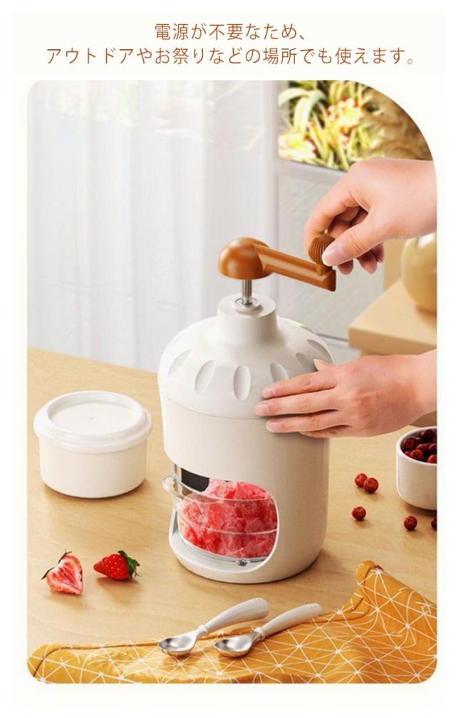 | 簡単に回すだけでふわふわのかき氷をどこででもつくって楽しめるかき氷メーカー。 夏を涼しく過ごす、ひんやり美味しいかき氷!操作が簡単で使いやすいため、子供から大人まで幅広い年齢層に人気があります。 電源が不要なため、アウトドアやお祭りなどの場所でも使えます。 | |