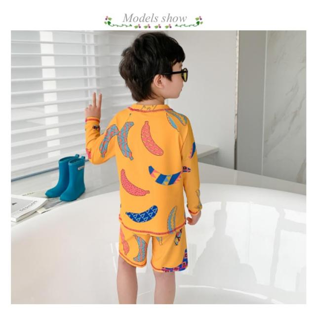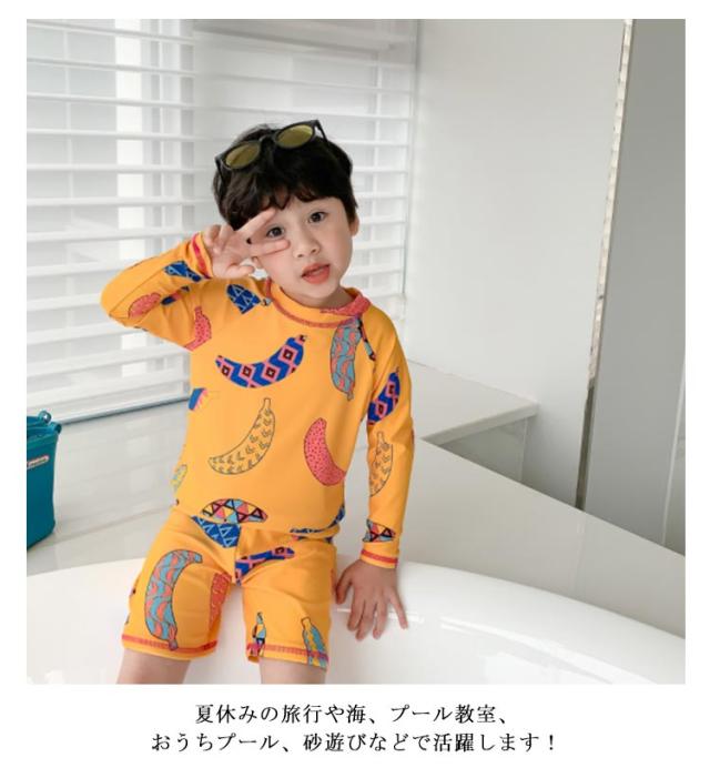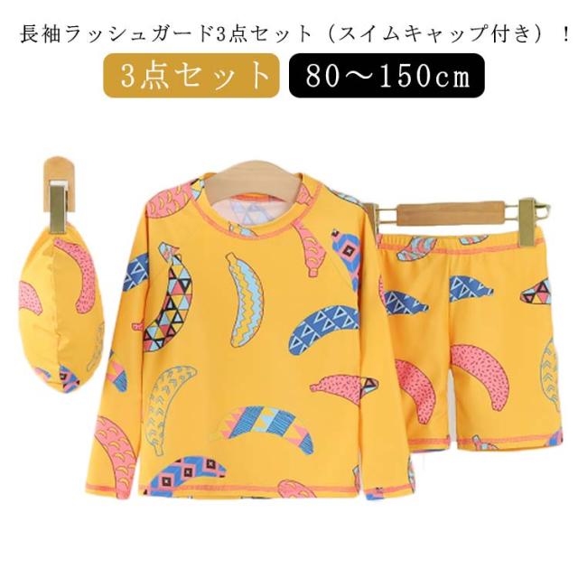 SPF50 日焼け防止 子ども用 送料無料 スイムウェア 上下セット こども服 スイムキャップ付き 長袖 ラッシュガード 幼児 おうちプール 110 水着 幼稚園 3点 小学生 紫外線対策 100 水着 120 130 140 150cm かわいい バナナ 海 夏休み 90 砂遊び 磯遊び アウトドア プール
