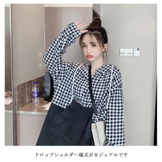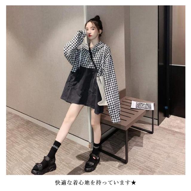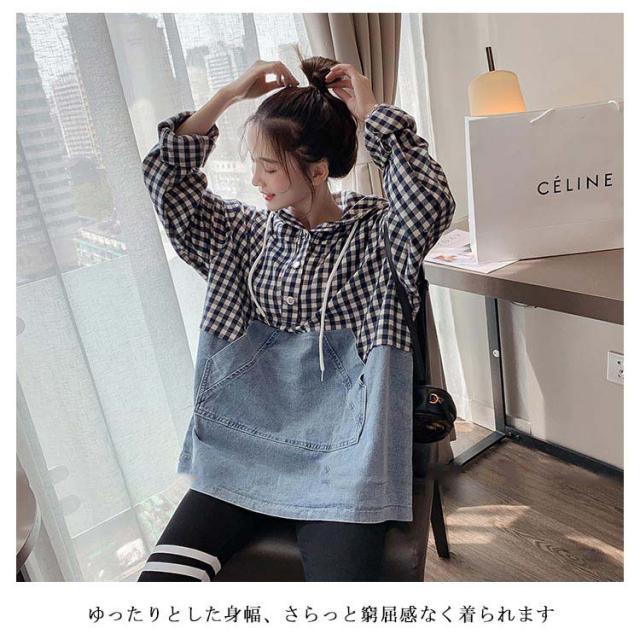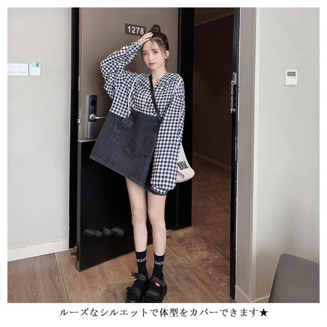 パーカー レディース チェック柄 プルパーカー デニム フード付き 切り替えパーカー フレア裾 ドロップショルダー ゆったり カジュアル ルーズ 体型カバー お洒落 キレイめ 普段着 トップス プルオーバー 春新作