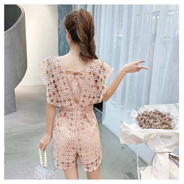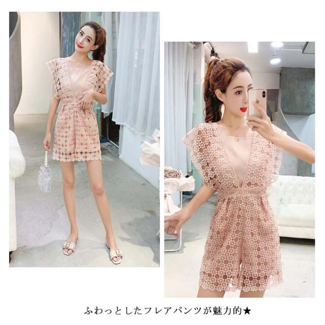オールインワン レディース ワイドパンツ ショートパンツ ミニパンツ Vネック 総レース 半袖 ワンピース 裏地付き 透け感 フレアパンツ キレイめ エレガント こなれ感 お洒落 セクシー 夏物 春新作