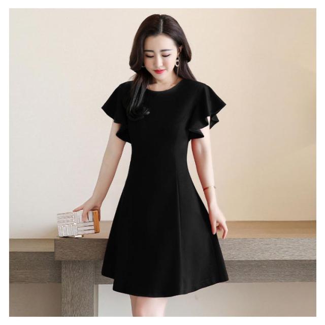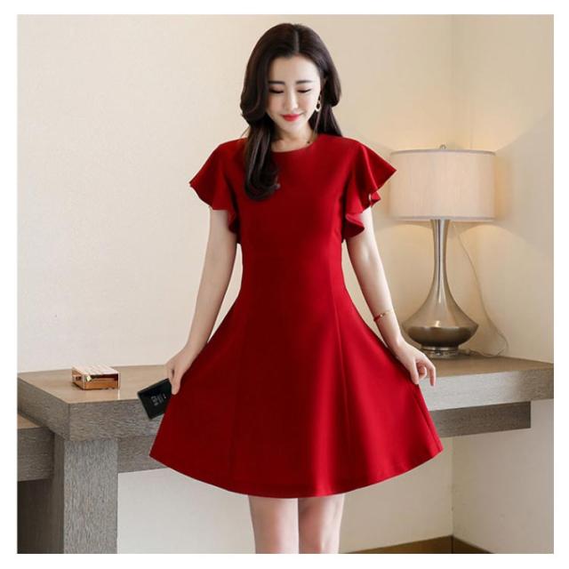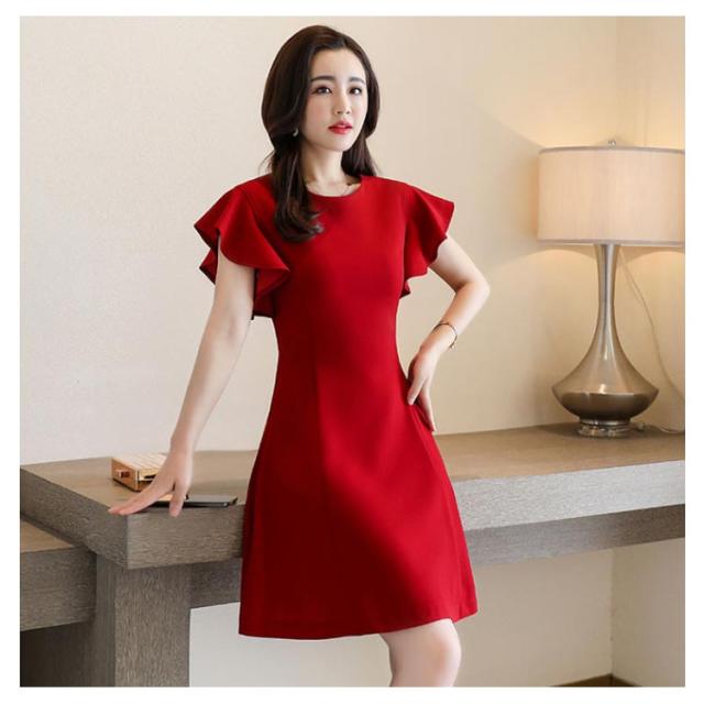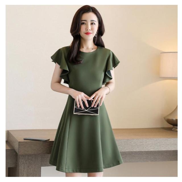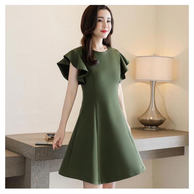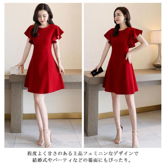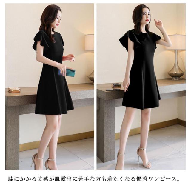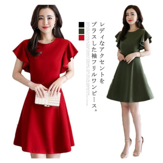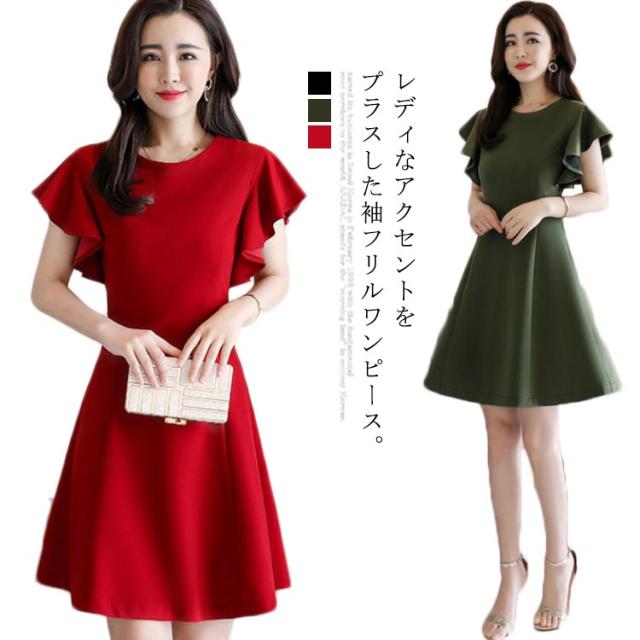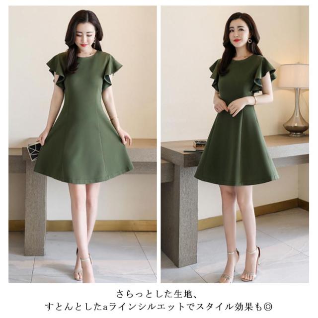 フリル袖ワンピース 半袖ワンピース 夏ワンピース 袖フリル ミディアムワンピース 結婚式 パーティー 通勤 シンプル 無地 フリル 可愛い