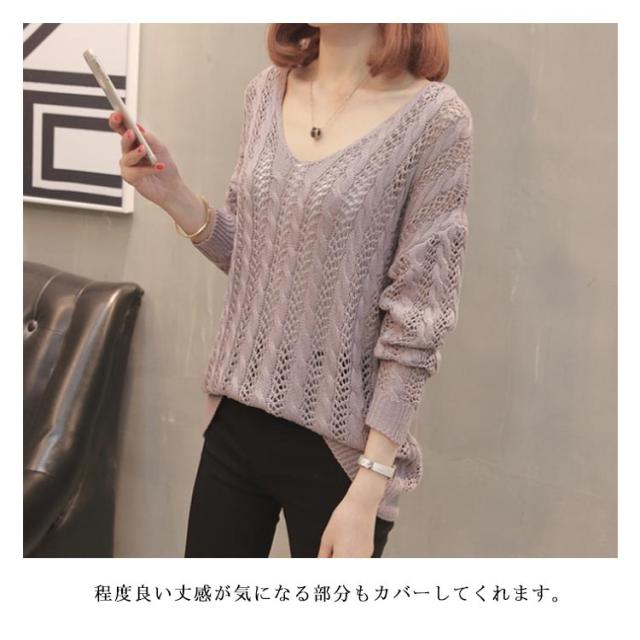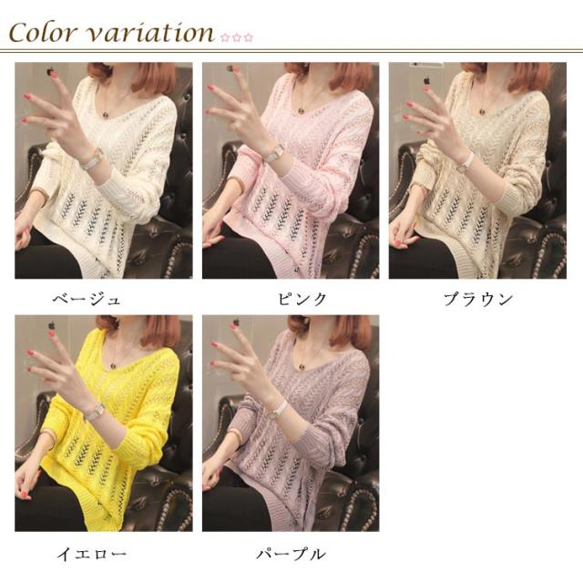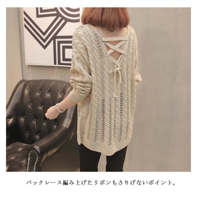 全5色!バックレース編み上げニットソー ロングニット シースルーニット 透け編み ニットトップス ロング Vネック プルオーバー シンプル 無地 春 夏 秋