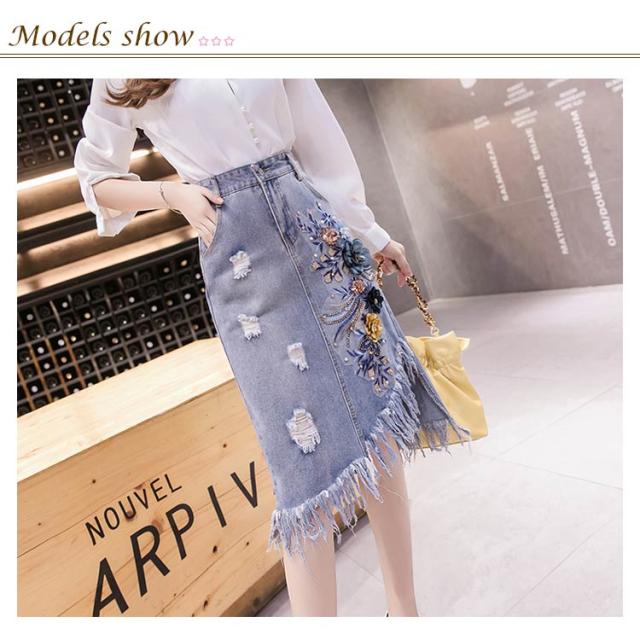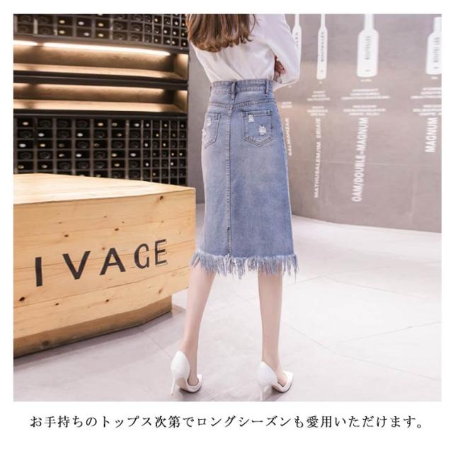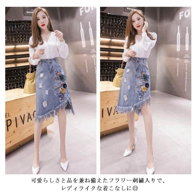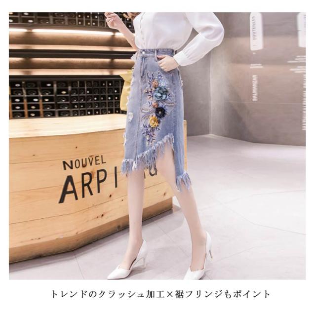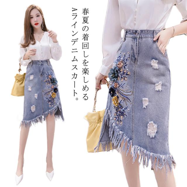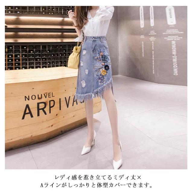 フリンジ裾デニムスカート スカート デニムスカート アシメトリー 切りっぱなし スカート ミディアム丈 花柄刺繍 aライン ハイウエスト 大きサイズ 春夏 夏 カジュアル 可愛い