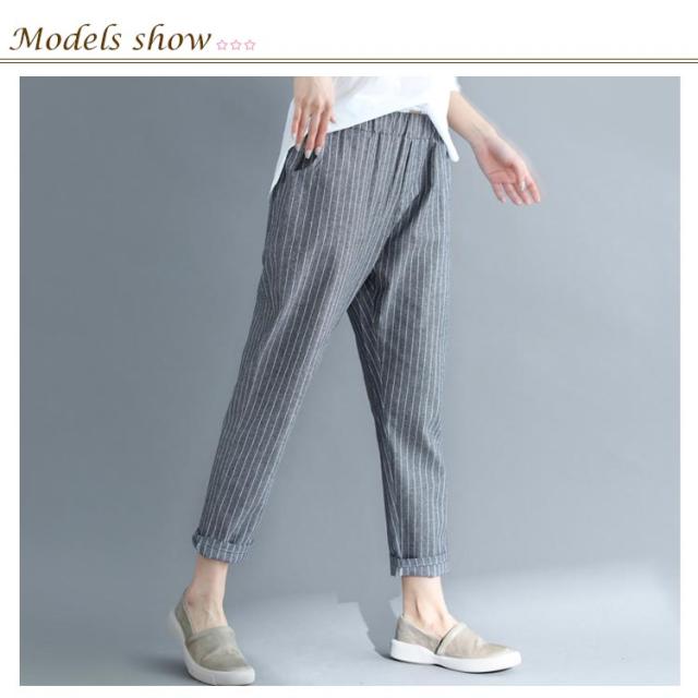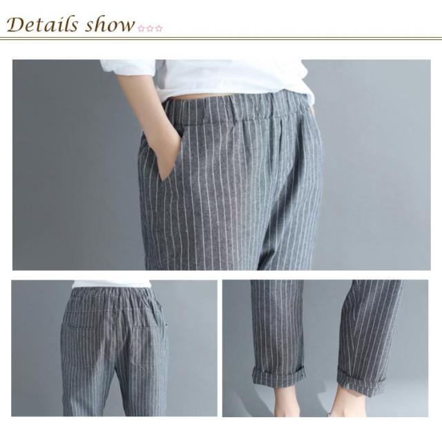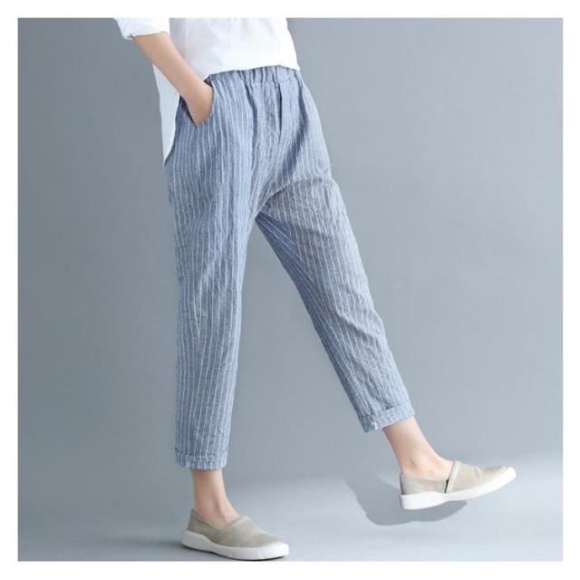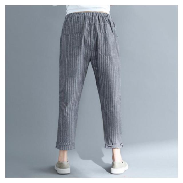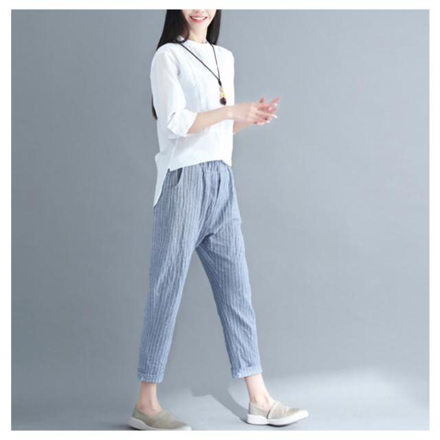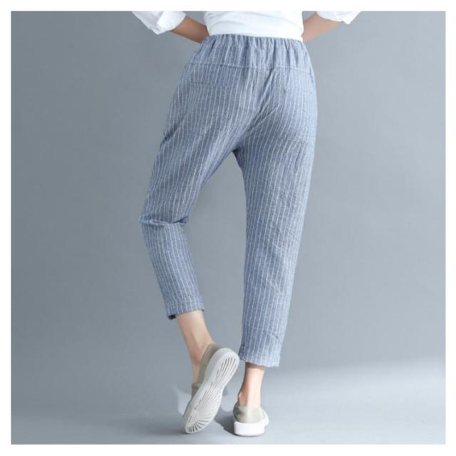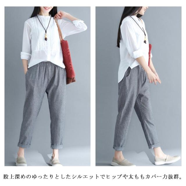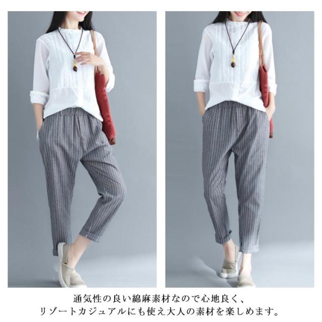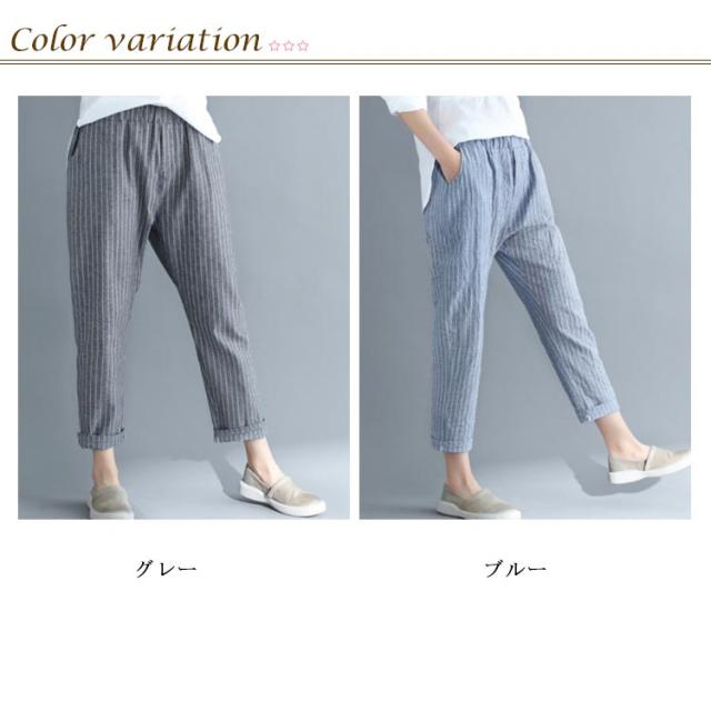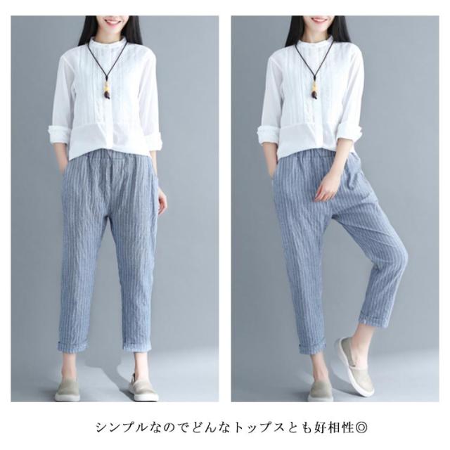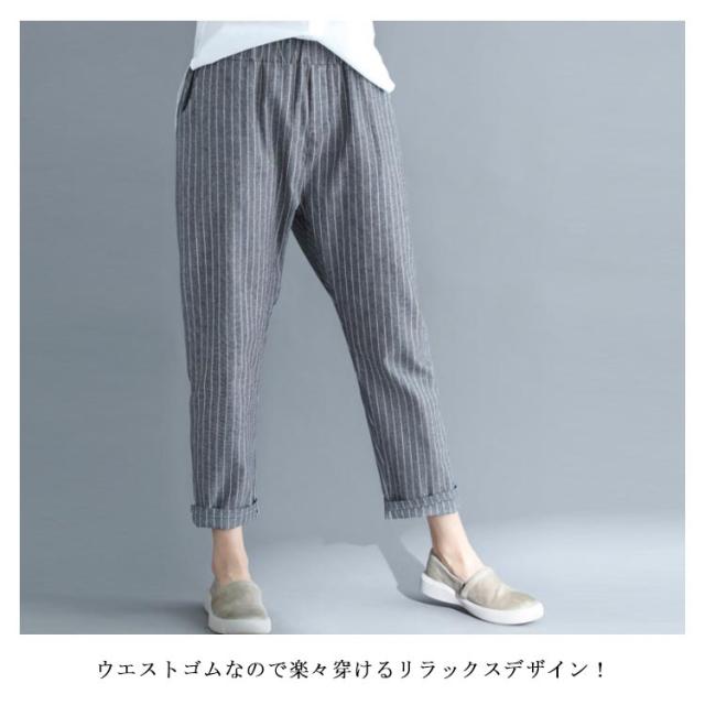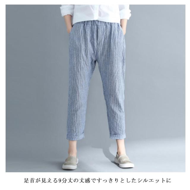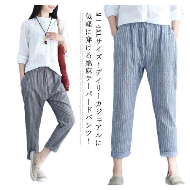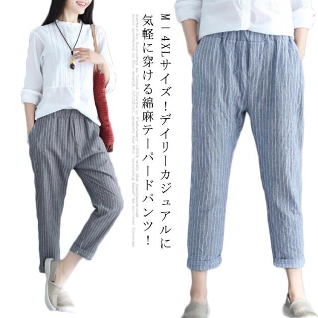 M−4XLサイズ!綿麻パンツ レディース リネンパンツ テーパードパンツ ストライプ柄 カジュアルパンツ 9分丈 テーパード ウエストゴム 麻 麻混 リネン シンプル 春夏