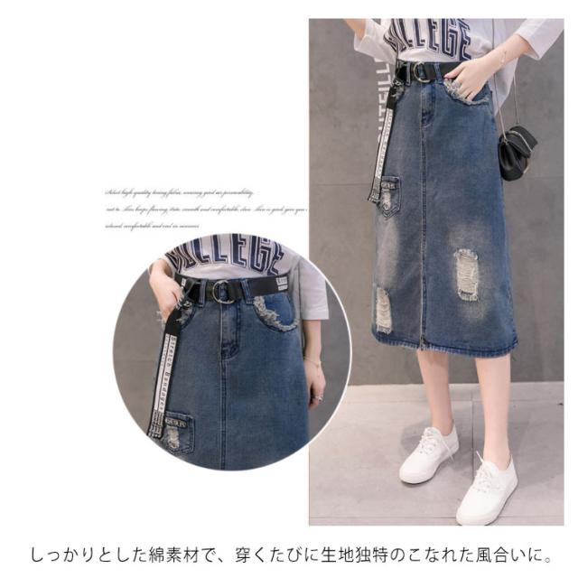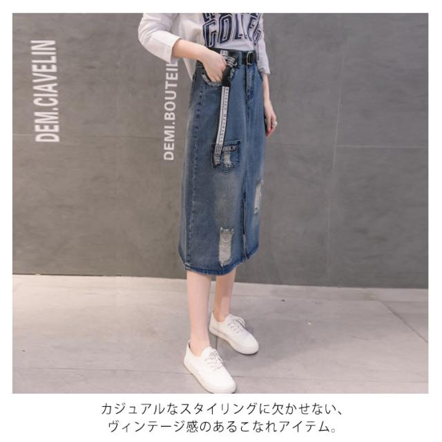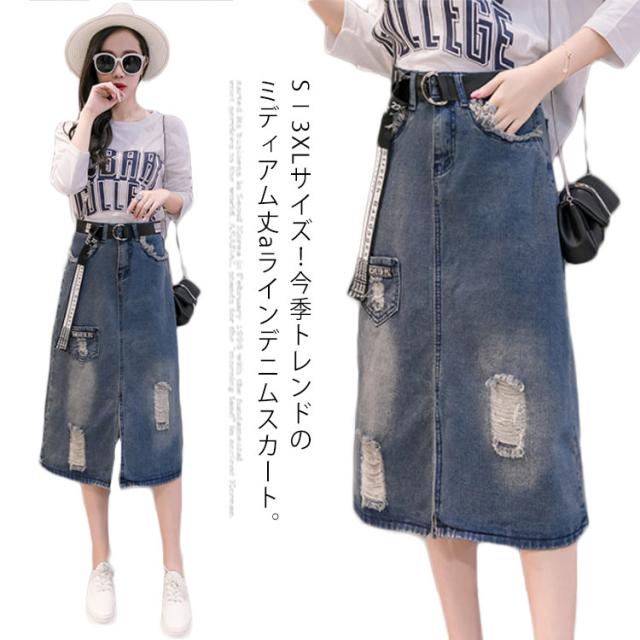 デニムスカート ミディアム ダメージ加工 スカート ロングスカート ハイウエスト aラインスカート フロントスリット カジュアル ゆったり 春 夏 秋 おしゃれ 可愛い 大きサイズ