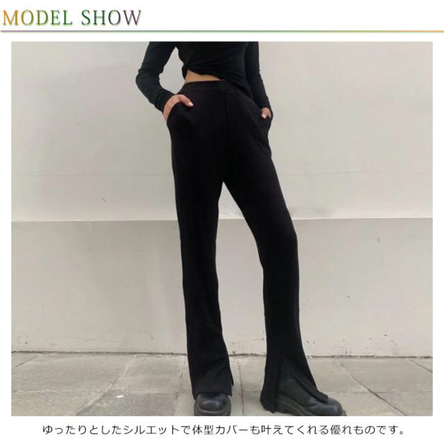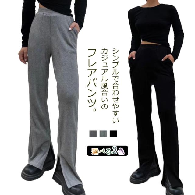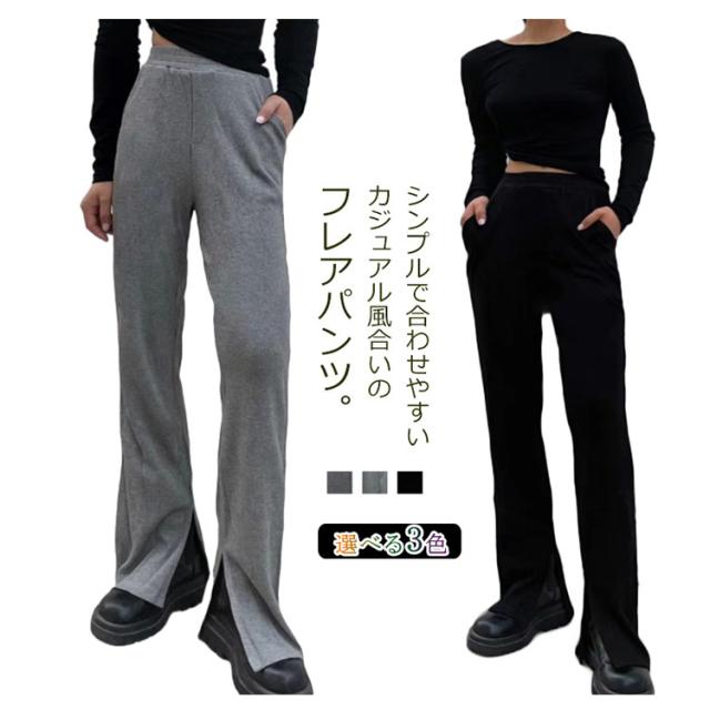 【送料無料】リブパンツ レディース 春 フレア パンツ ボトムス ストレッチ サイドスリット ウエストゴム フレア ハイウエスト パンツ ロングパンツ 春夏秋 リラックス 無地 フィット カジュアル