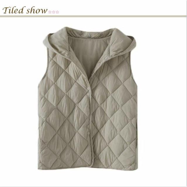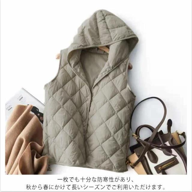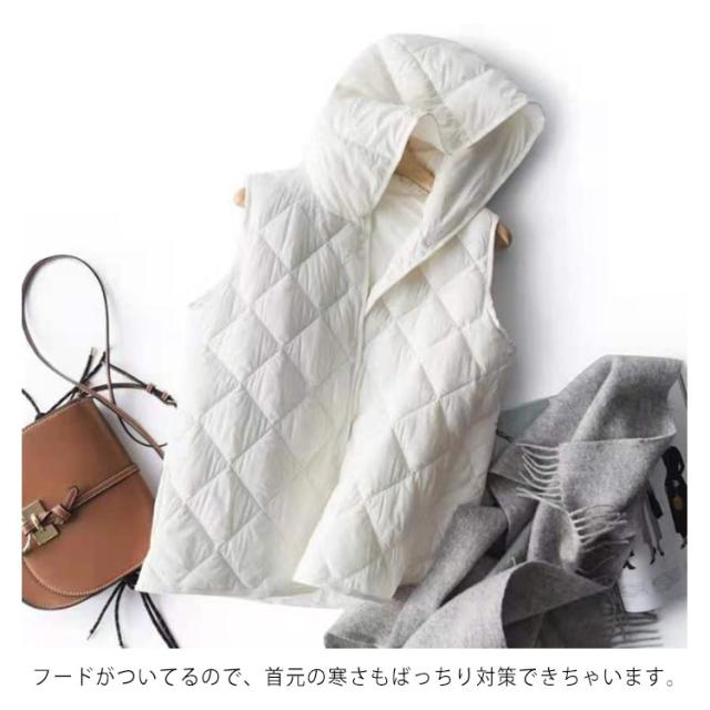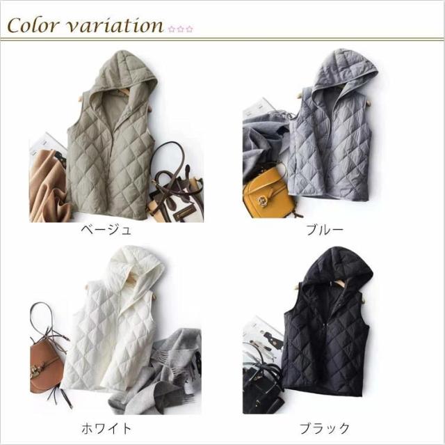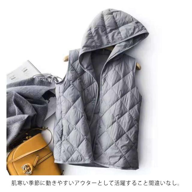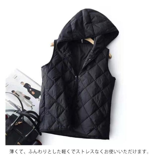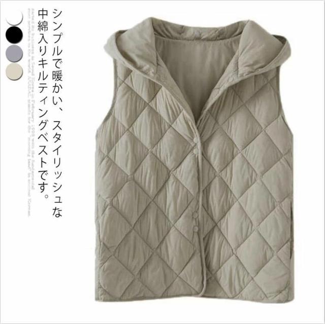中綿ベスト レディース 超軽量 薄手 ゆったり フード付き ノースリーブ 重ね着 トップス チョッキ 前開き カジュアル 秋冬 キルティング 防寒 お洒落 シンプル