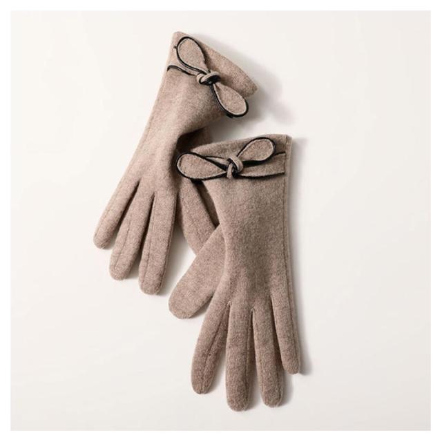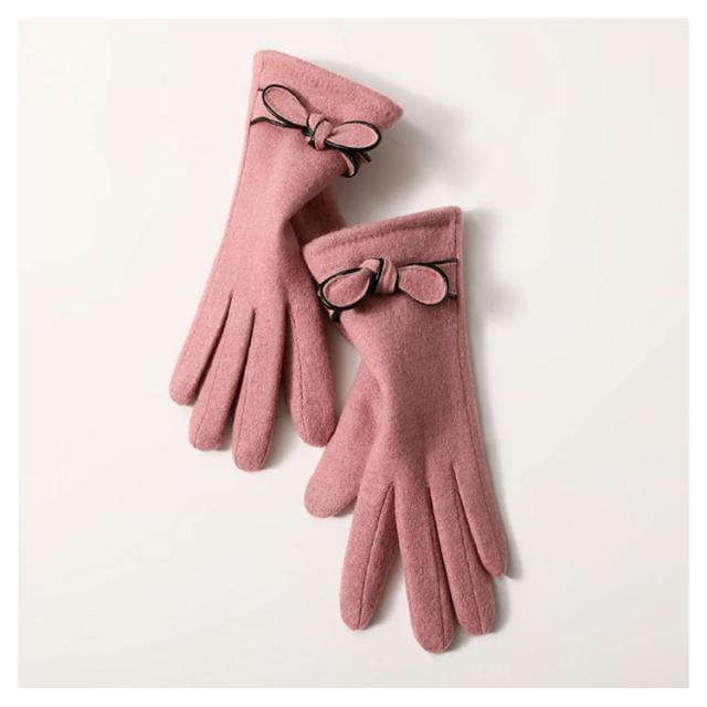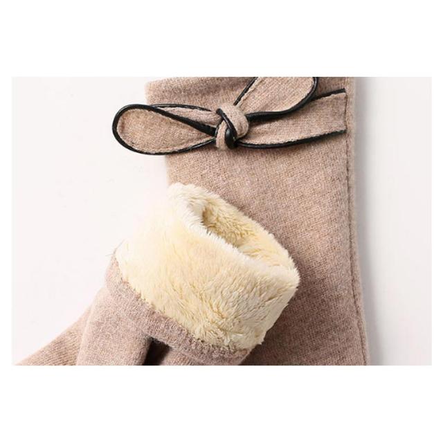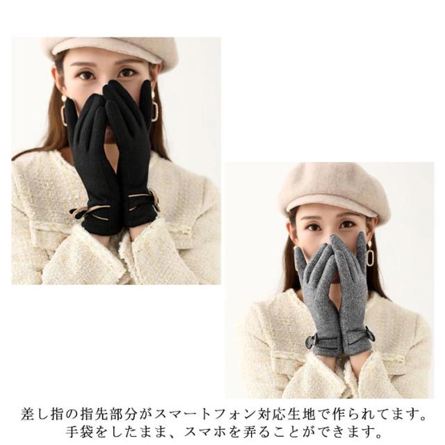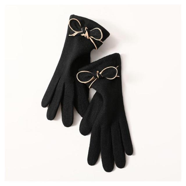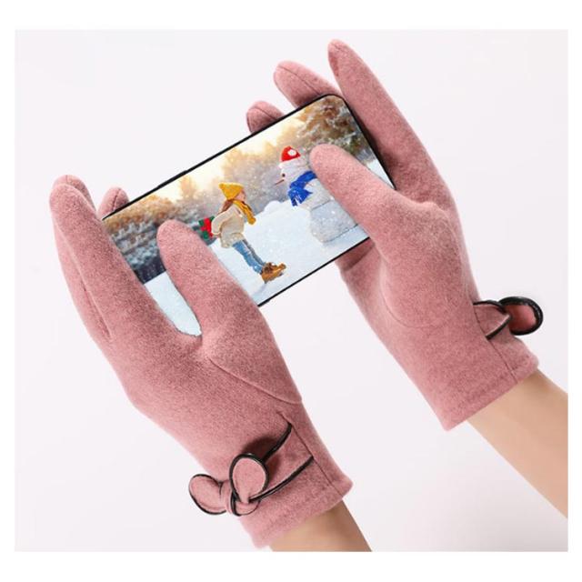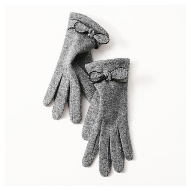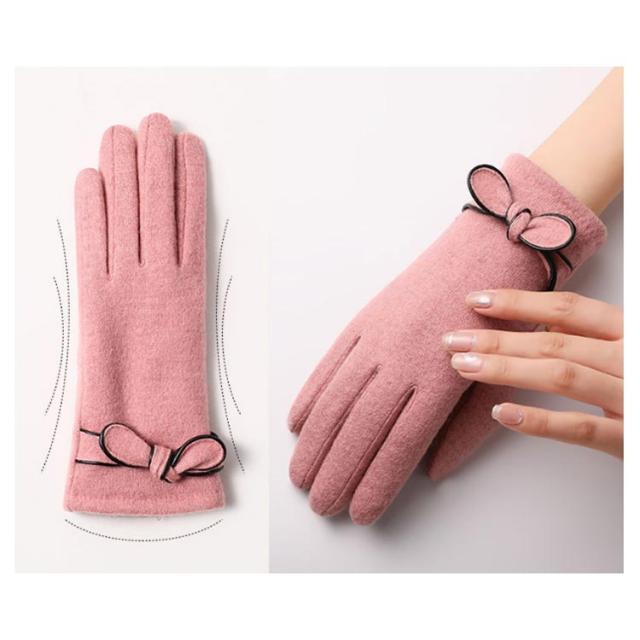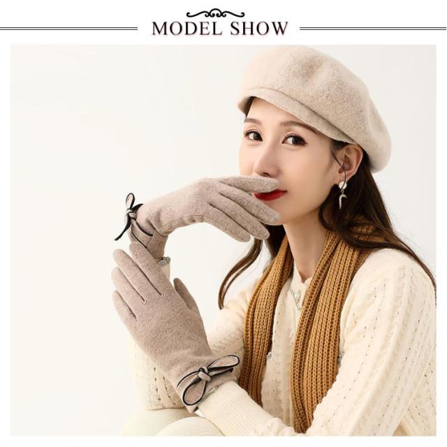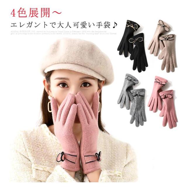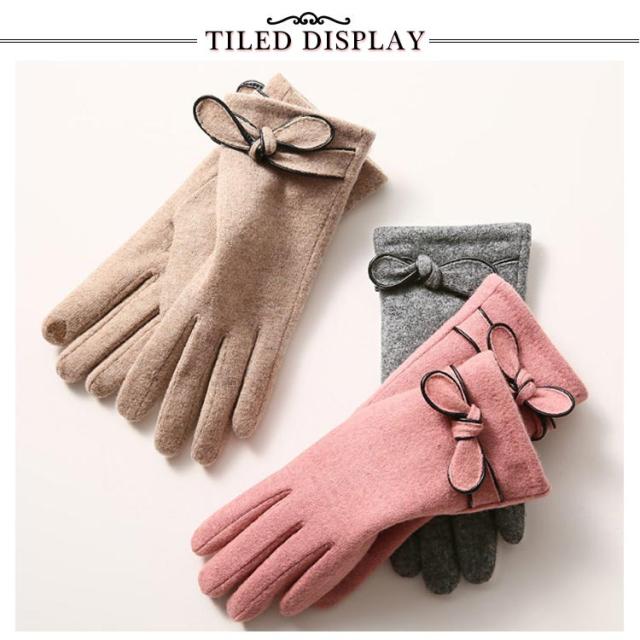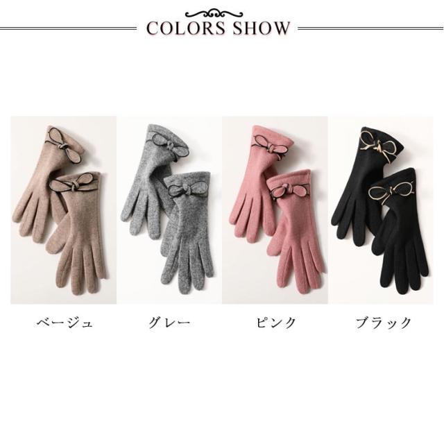 | 4色展開〜エレガントで大人可愛い手袋♪ リボン付きで可愛いらしい? 表地はウール混、内側は裏ボア、寒い日も指先まで暖かくお過ごし頂けます。 差し指の指先部分がスマートフォン対応生地で作られてます。手袋をしたまま、スマホを弄ることができます。 | |