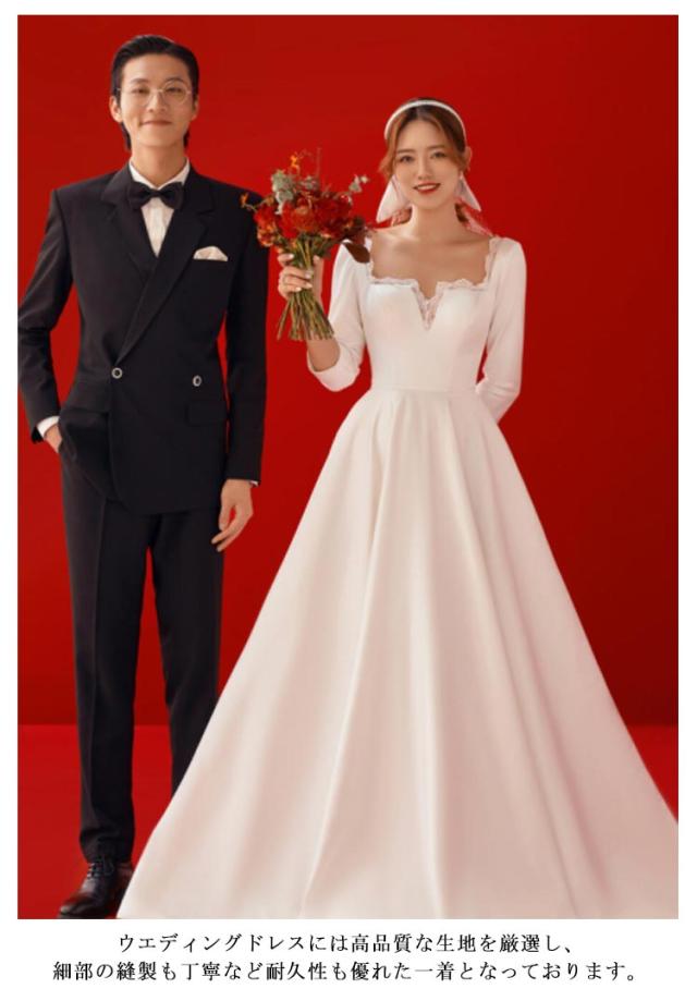 ウェディングドレス 結婚式 二次会 花嫁 ドレス 白ワンピース エンパイアライン ロングドレス 披露宴 袖あり vネック ハイウエスト上品 エレガント エンパイアライン 無地