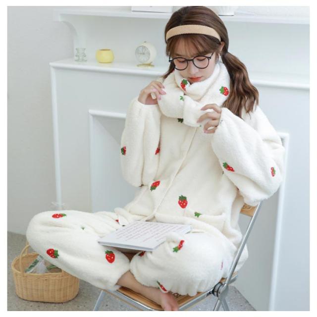 パジャマ ルームウェア もこもこ ふわふわ いちご柄 スカーフ付き いちごパジャマ 可愛い オシャレ SNS超人気 大勧め 防寒 上下セット 上品 暖かい 部屋着 ファッション 肌触りいい ホワイト ピンク グリーン くまちゃん チェリー柄 クリスマス 誕生日
