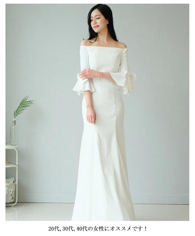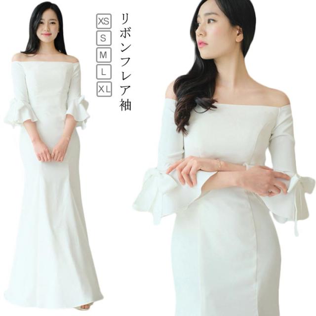 ウェディングドレス マーメイドライン ロングドレス ウェディング ウエディング オフショルダー パーティードレス フィッシュテール フレア袖 袖リボン 結婚式 ワンピース 海外 挙式 ホワイト 白 ロング丈 ドレス