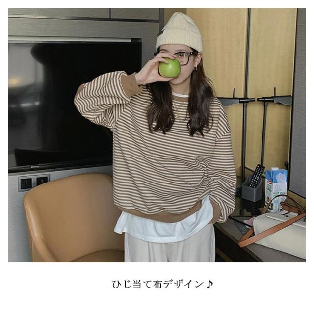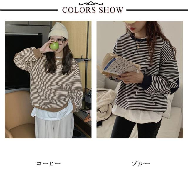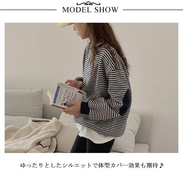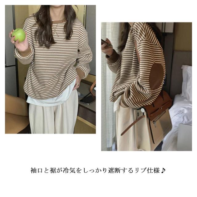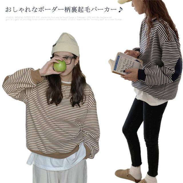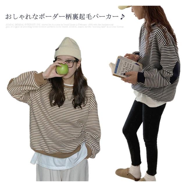 裏起毛パーカー レディース パーカー 裏起毛 ボーダー 長袖 トップス プルオーバー ドロップショルダースリーブ ゆったり ゆるパーカー ひじ当て布 シンプル 上品 お洒落 カジュアル 秋冬