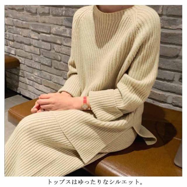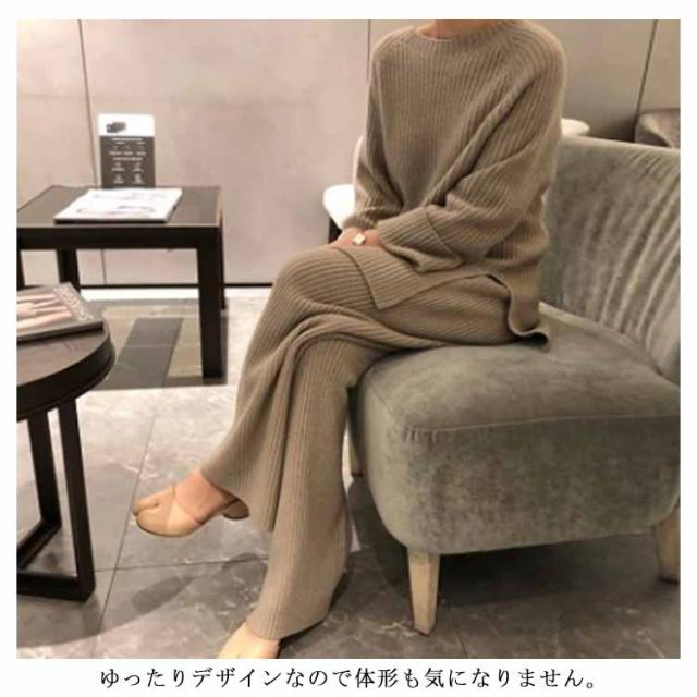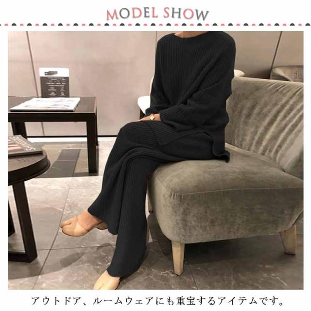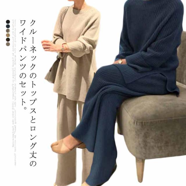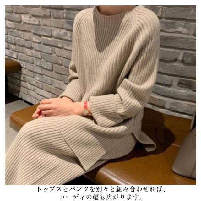 セットアップ レディース ニット 2点セット 長袖+ズボン パンツスーツ 秋冬 ニットパンツ ニットセーター 体型カバー サイドスリット クルーネック ロング丈 厚手 OL 通勤 お出かけ カジュアル ゆったり