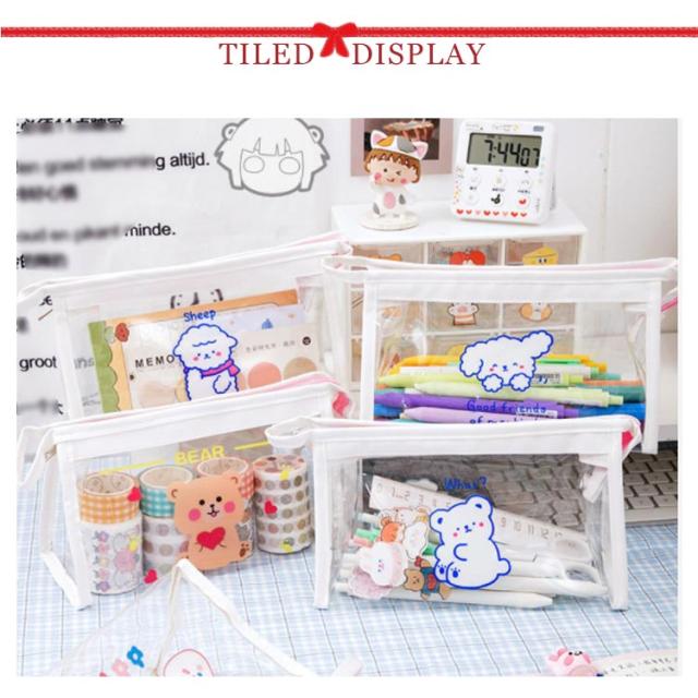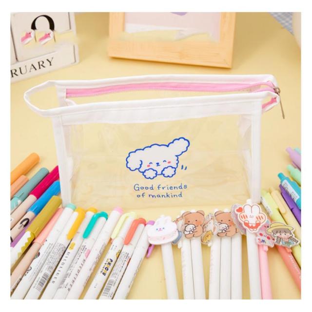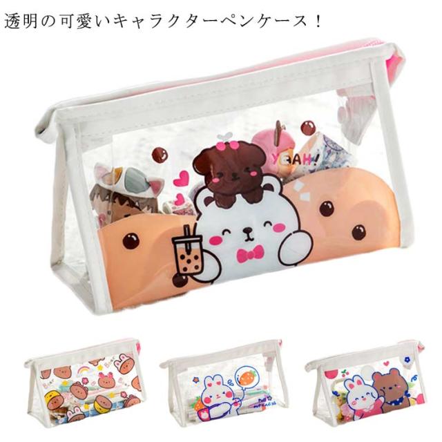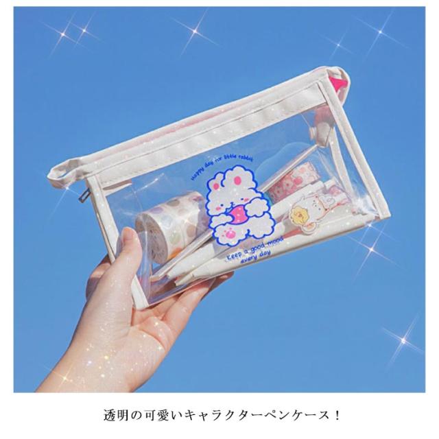 | 透明の可愛いキャラクターペンケース! ワイドな8cmのマチだから大容量!ハサミやカッター、テープ、ホチキスまで何でも収納できます。 文具の他にも、コスメ関係や趣味の小物、旅行用品などの整理・持ち運びに便利なポーチです。 | |