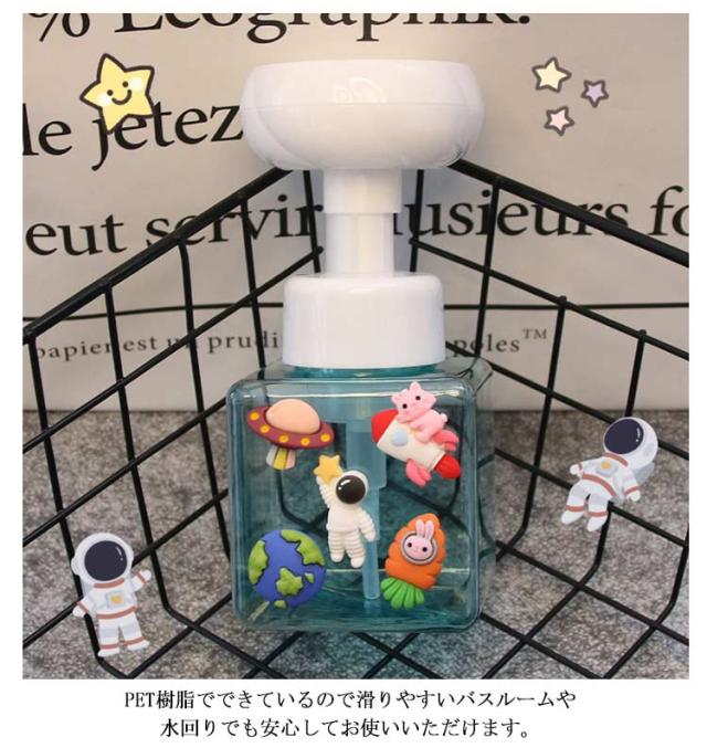 | キャラクター付き、おしゃれな泡ディスペンサーボトル。 詰め替え用のハンドソープ,キッチン洗剤などにもご利用可能 泡タイプになります。(ストレートタイプではありません) PET樹脂でできているので滑りやすいバスルームや水回りでも安心してお使いいただけます。 残量が一目でわかり、中身の入れ替え時期が把握できる透明容器。 詰め替える時は上蓋が外れ、注ぎやすいのもうれしいポイント。 | |