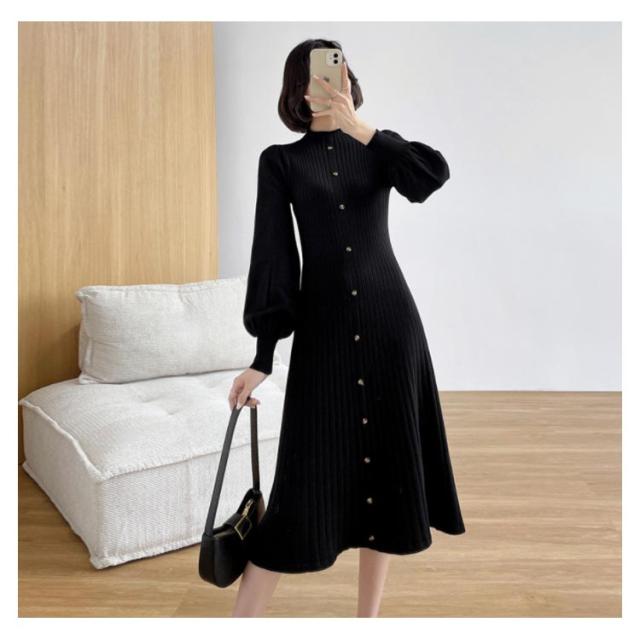 リブニットワンピース ニットワンピース ニットワンピ プリーツ加工 ロング Aラインロングワンピース ワンピース ボトルネック aライン ロングワンピース 膝下丈 秋冬 フレア シンプル 無地 オシャレ 女性 リブ