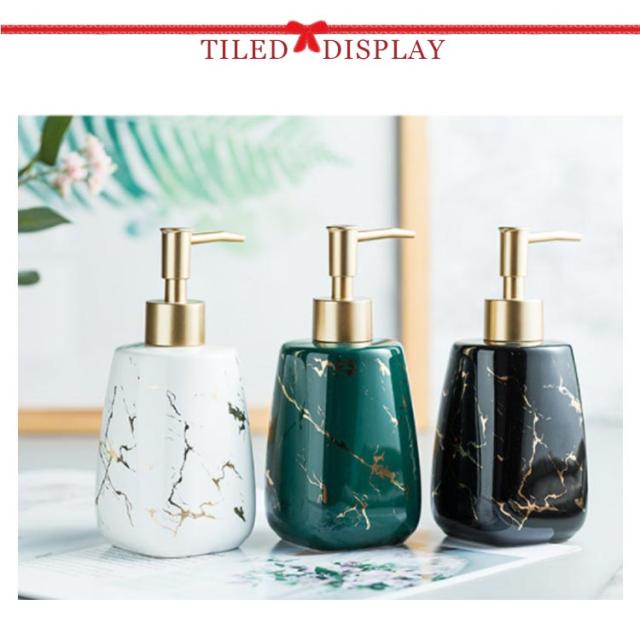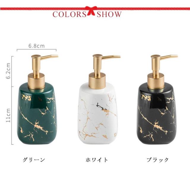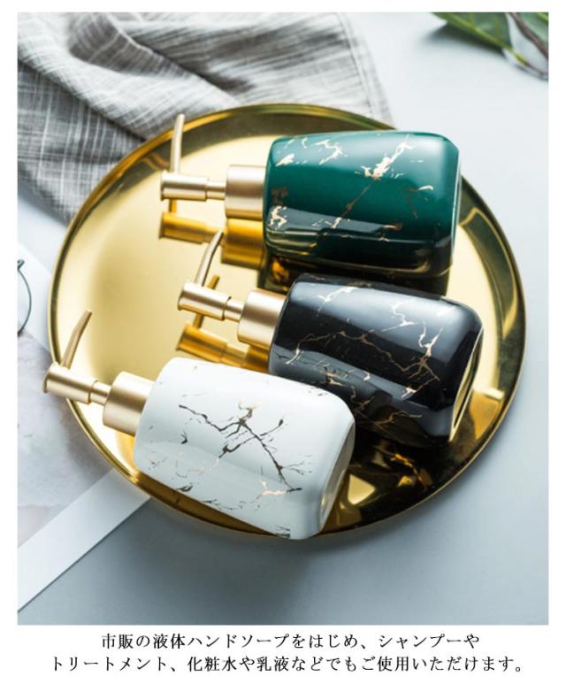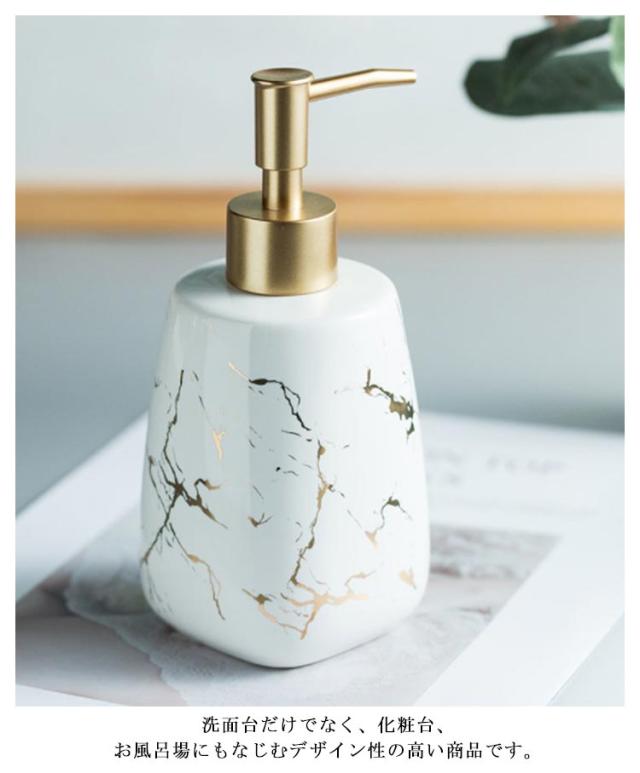 | 生活感が出がちな水周りに 置くだけで存在感のある、セラミック製のお洒落なディスペンサー 市販の液体ハンドソープをはじめ、 シャンプーやトリートメント、化粧水や乳液などでもご使用いただけます。 洗面台だけでなく、化粧台、お風呂場にもなじむデザイン性の高い商品です。 大理石タイプ…自然なゴールドの彩色。一つ一つ違った風合いを見せる大理石のペイントが魅力。 無地タイプ…シンプルにスッキリまとまり、マットな光沢が高級感を演出。 | |