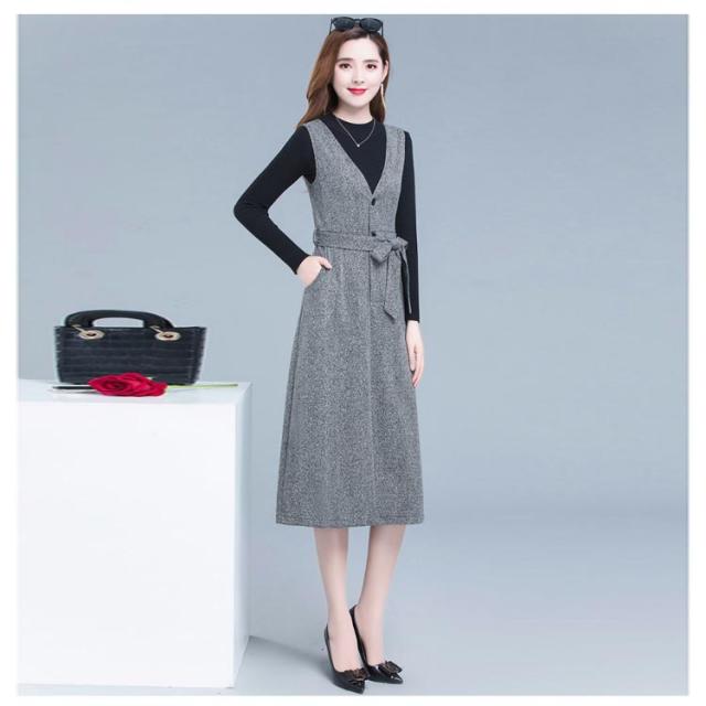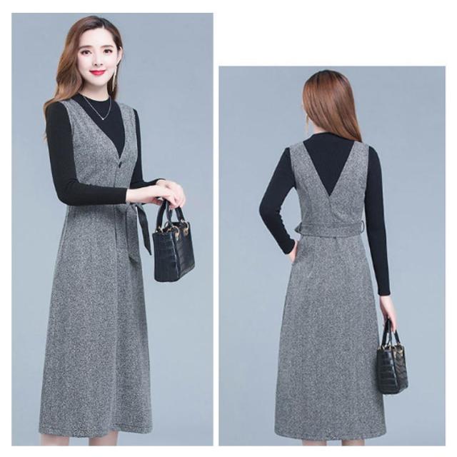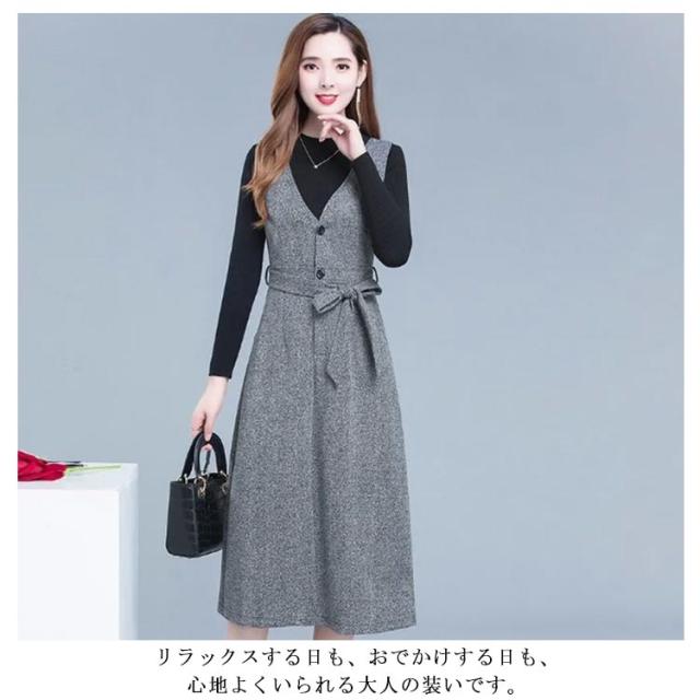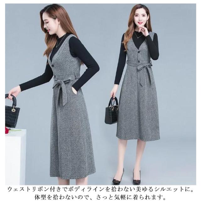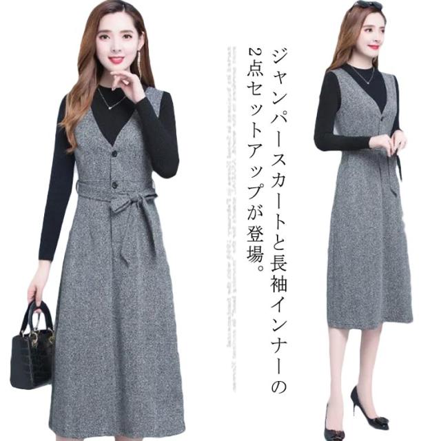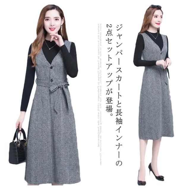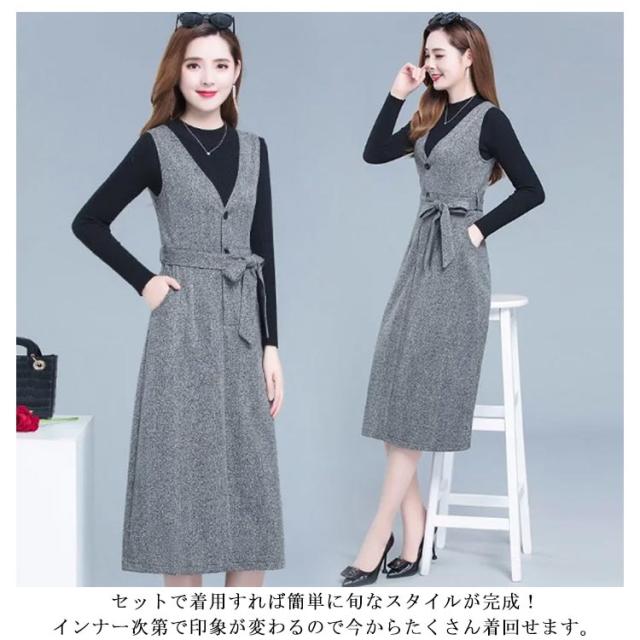 ジャンパースカート Vネック インナー セットアップ レディース 2点セット 秋冬 大人 深Vネック ウェストリボン ロング丈 ノースリーブ ワンピース ハイウェスト 着痩せ 体型カバー ジャンスカ 重ね着 レイヤード 大人 フォーマル きれいめ 通勤