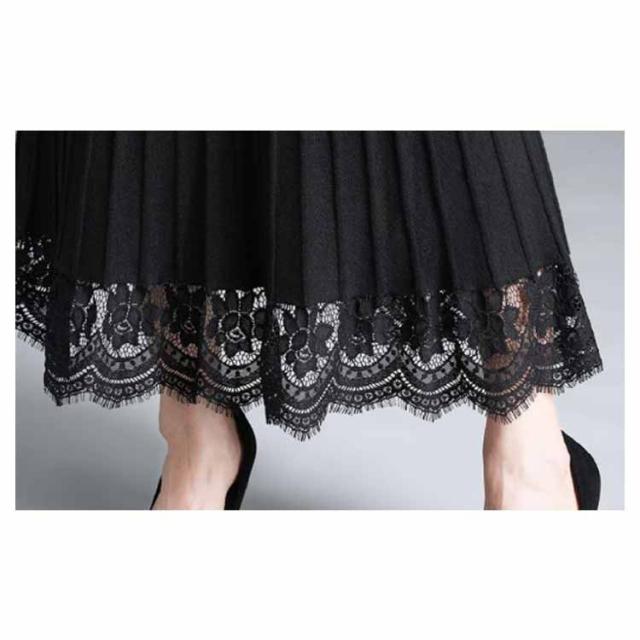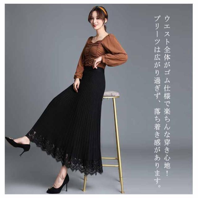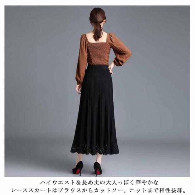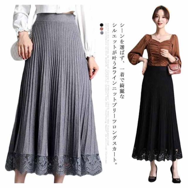 レース裾 プリーツスカート ニットスカート 秋 冬 Aライン フレアスカート ロングスカート 花柄 レース 切り替え スカート ロング ニット レディース マキシ プリーツ ウェストゴム ストレッチ 大人 おしゃれ フェミニン カジュアル 通勤 とらみ