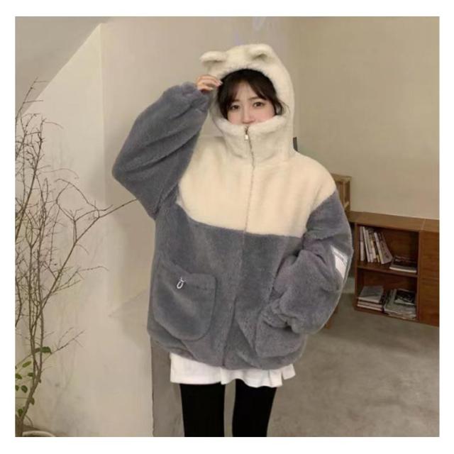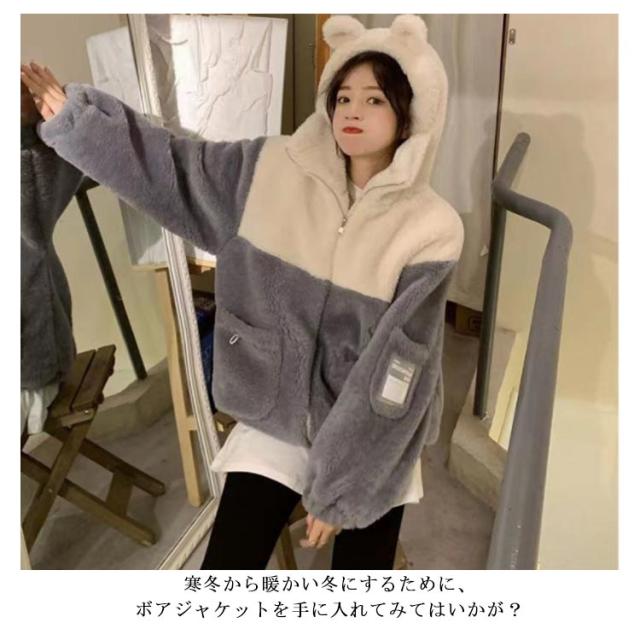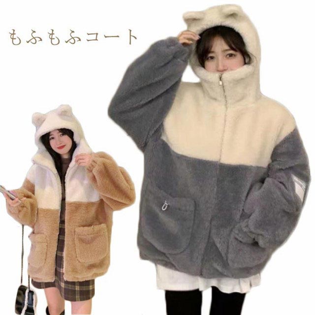 もふもふコート ボアコート もこもこ アウター 熊耳 クマ耳 ふわふわ もこもこパーカー フード付き かわいい ジャケット 秋冬 高校生 姉妹 お揃い 大人可愛い もこもこジャケット オーバーサイズ ゆったり