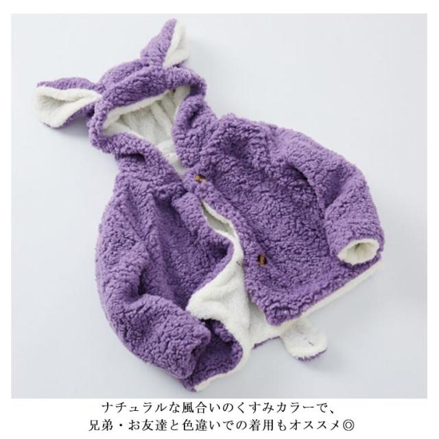 | ふわふわの触り心地が気持ちの良いボアフリース素材の兎耳パーカーが新登場です。 可愛さもあたたかさも良いとこどりのジップアップパーカーは秋冬のコーデを可愛く仕上げてくれます。 ナチュラルな風合いのくすみカラーで、兄弟・お友達と色違いでの着用もオススメ◎ もこもこ素材で、秋冬のマストアウターになること間違いなしのアイテムです。 | |