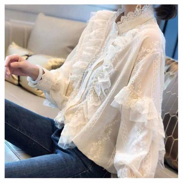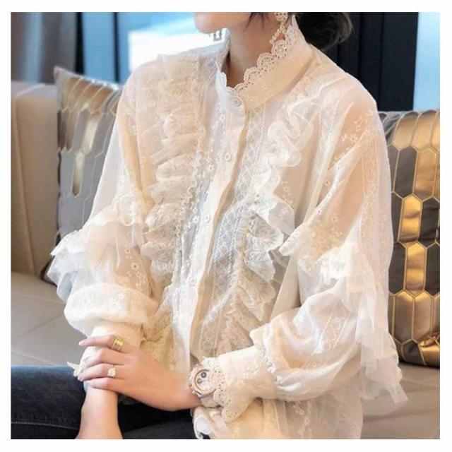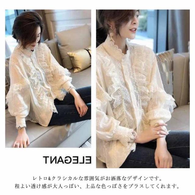 レース ブラウス トップス レディース 長袖 刺繍 シャツ レースシャツ 白シャツ ワイシャツ 総レース 春秋 春服 秋服 パフスリーブ オフィス 通勤 フォーマル エレガント ホワイト ママ 母 20代 30代 40代