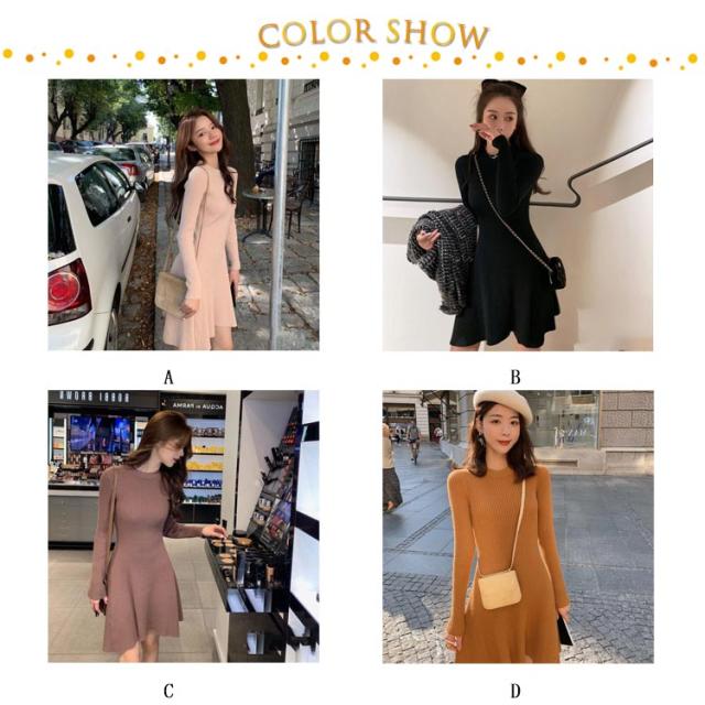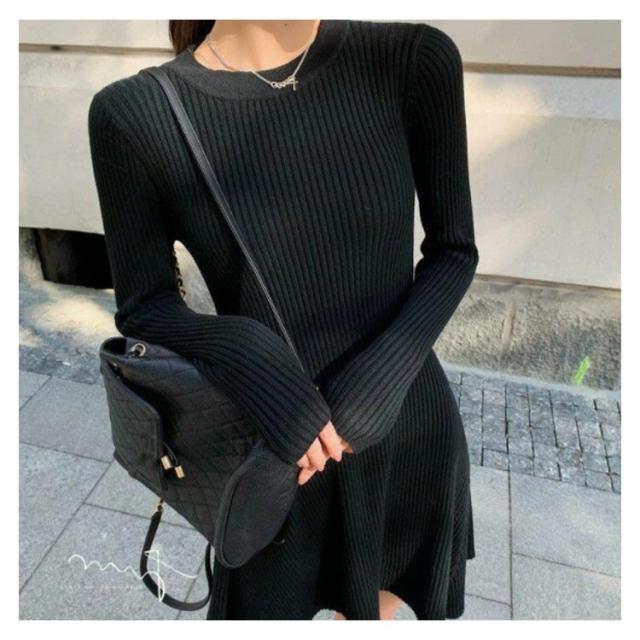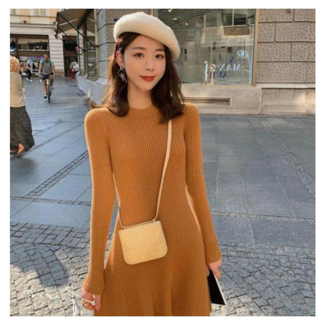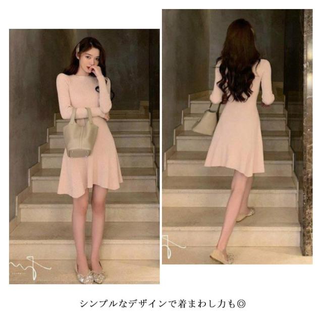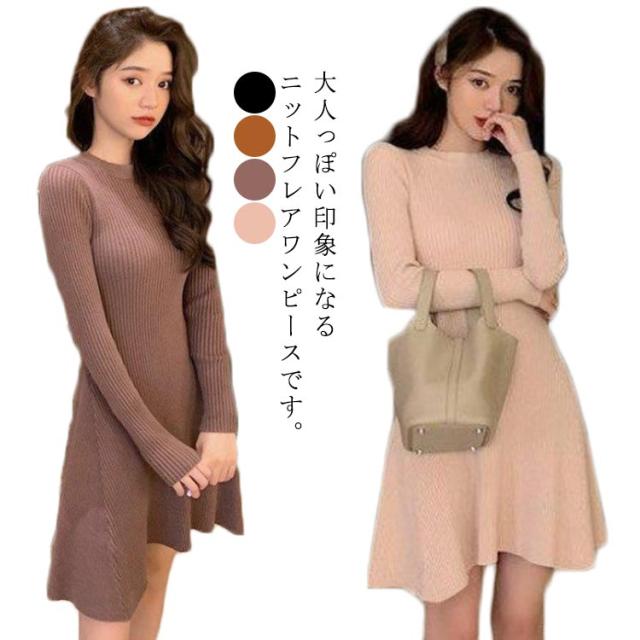 ニットワンピース 無地 ロング フレアワンピース リブニット ワンピース 膝丈 長袖 春秋ワンピ タイトワンピース フレア ひざ丈 お呼ばれ オフィス 通勤 お出かけ デート エレガント