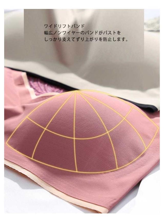 | 自由を叶える快適ブラ ノンワイヤーだから楽 幅広ショルダーで肩の負担を軽?してしっかり支えます。 背面も幅広設計 ノンホックで着けやすいだけではなく、背中も綺麗です。 ワイドリフトバンド 幅広ノンワイヤーのバンドがバストをしっかり支えてずり上がりを防止します。 伸縮性に優れた生地は、就寝時やリラックスタイムにも使います。24時間フルに活躍、美胸キープするならこれです! | |