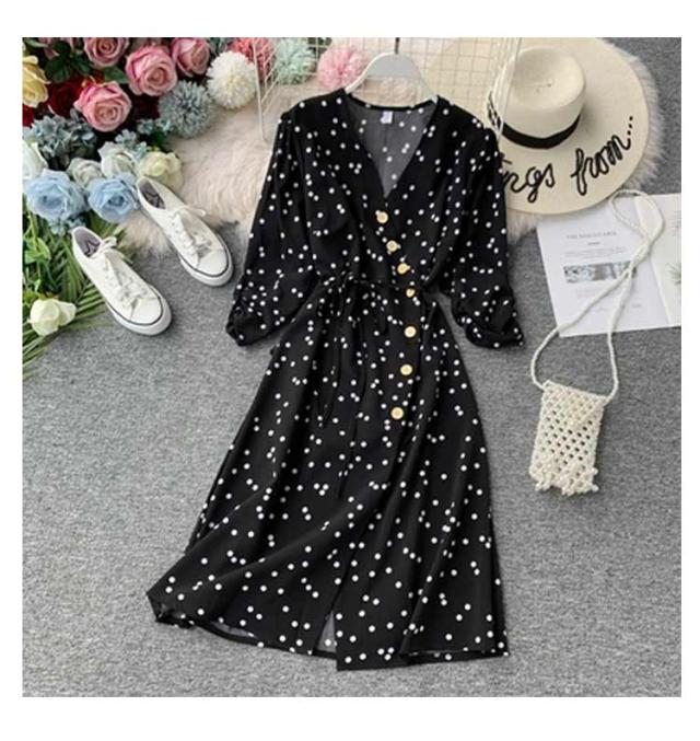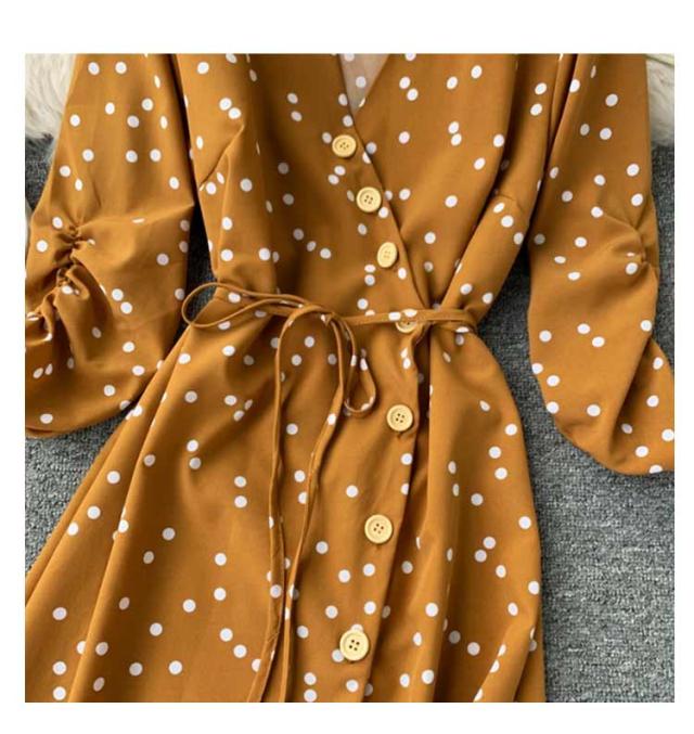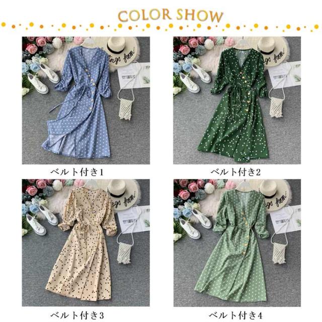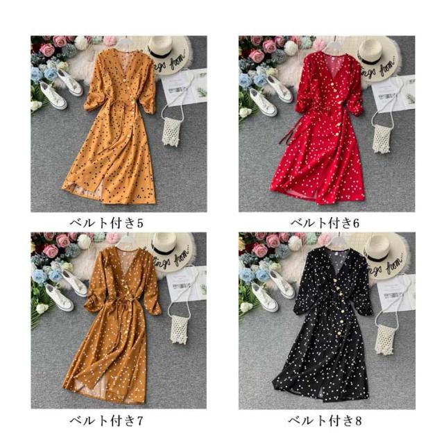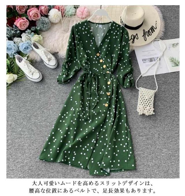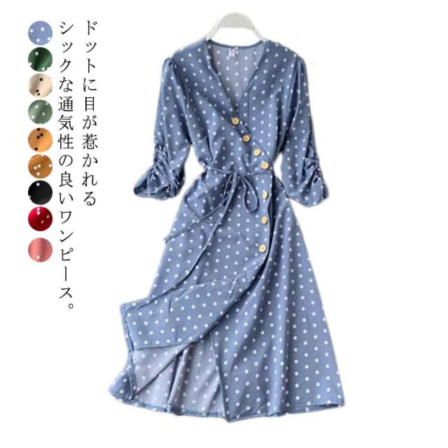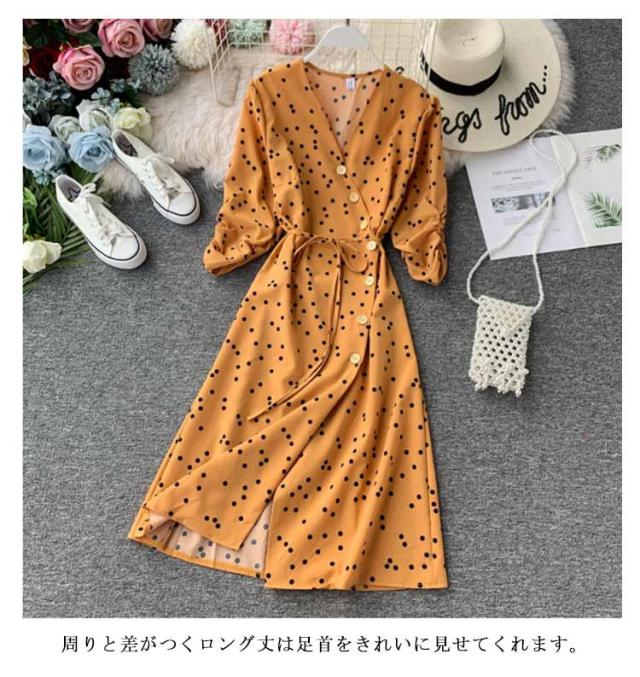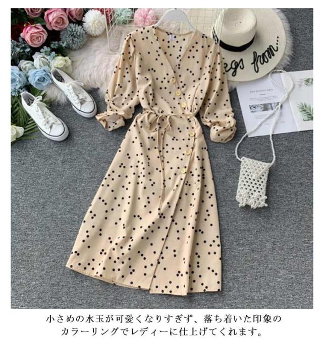 水玉ロングワンピース ロングワンピース Vネック 長袖 水玉 ロング丈 フレアスカート aラインスカート ひざたけ 膝丈 秋 春秋 送料無料