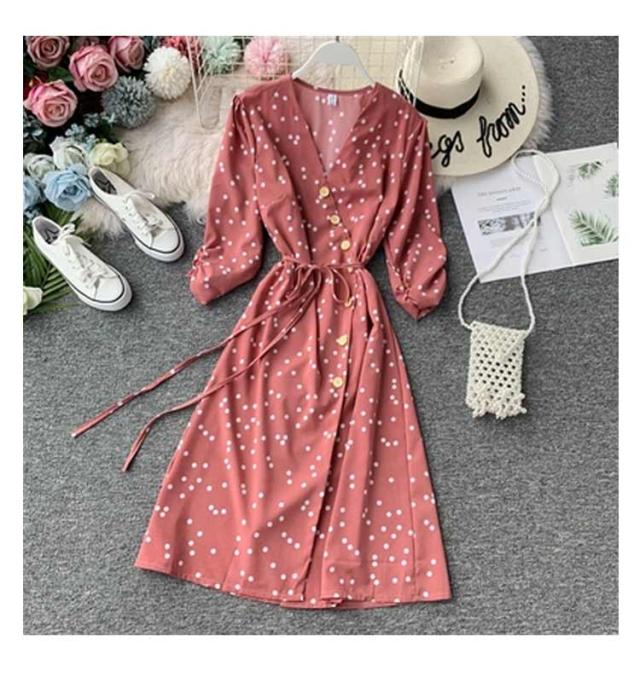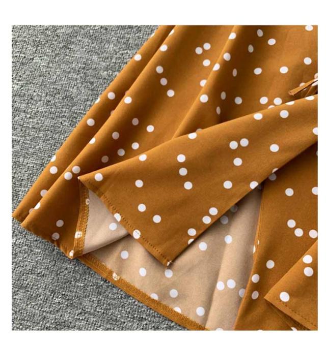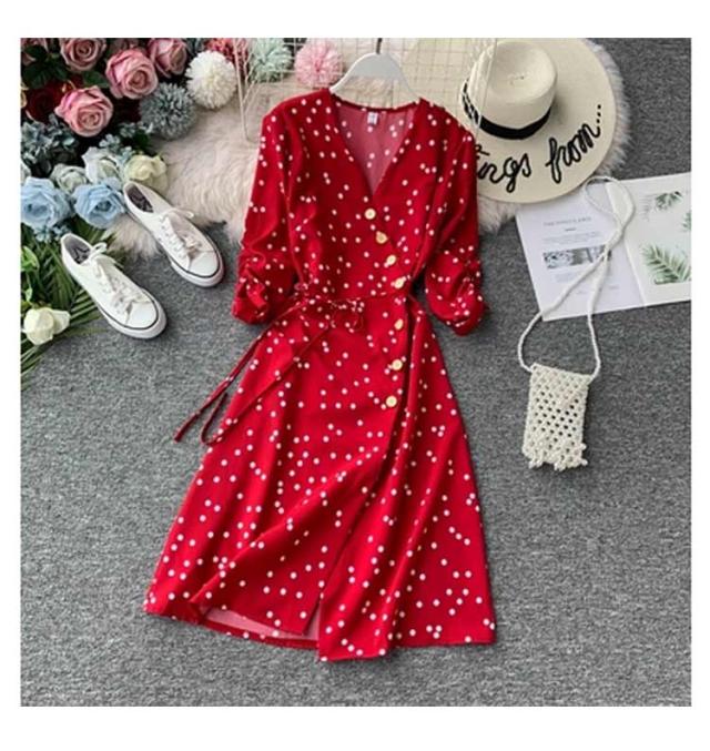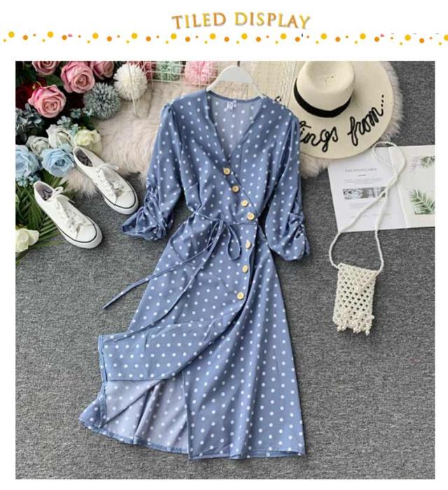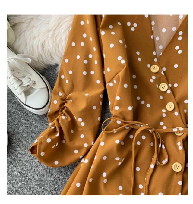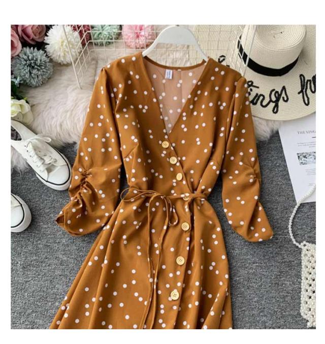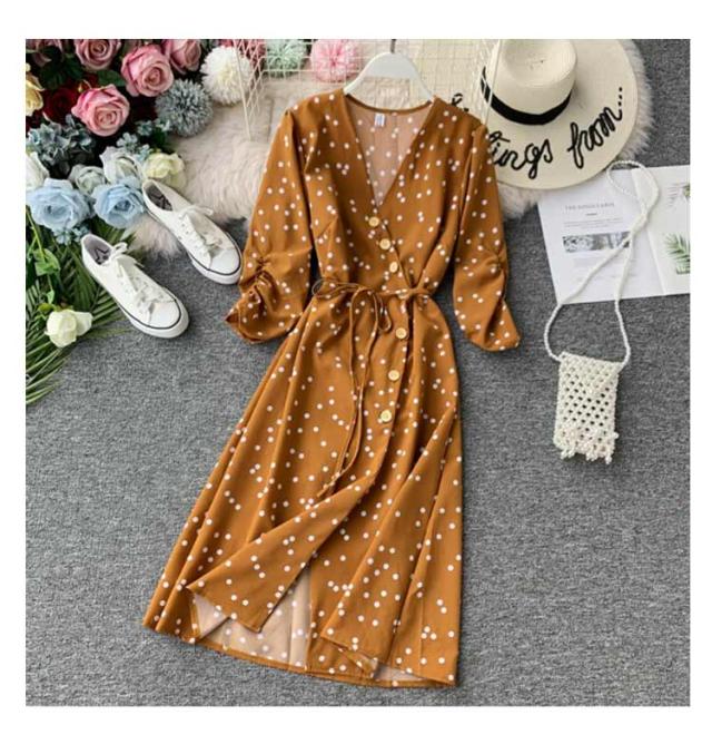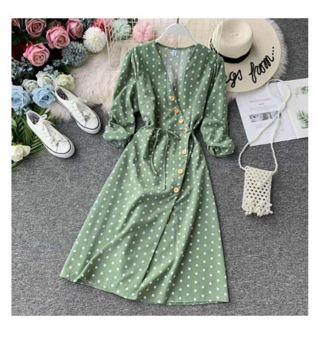 水玉ロングワンピース ロングワンピース Vネック 長袖 水玉 ロング丈 フレアスカート aラインスカート ひざたけ 膝丈 秋 春秋 送料無料