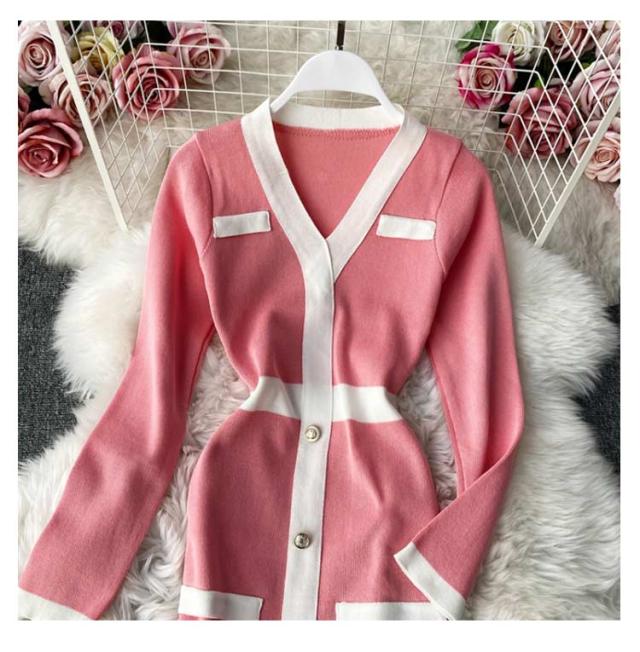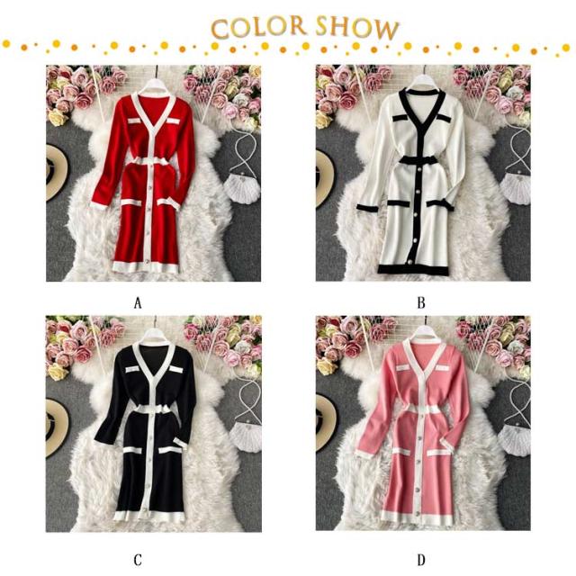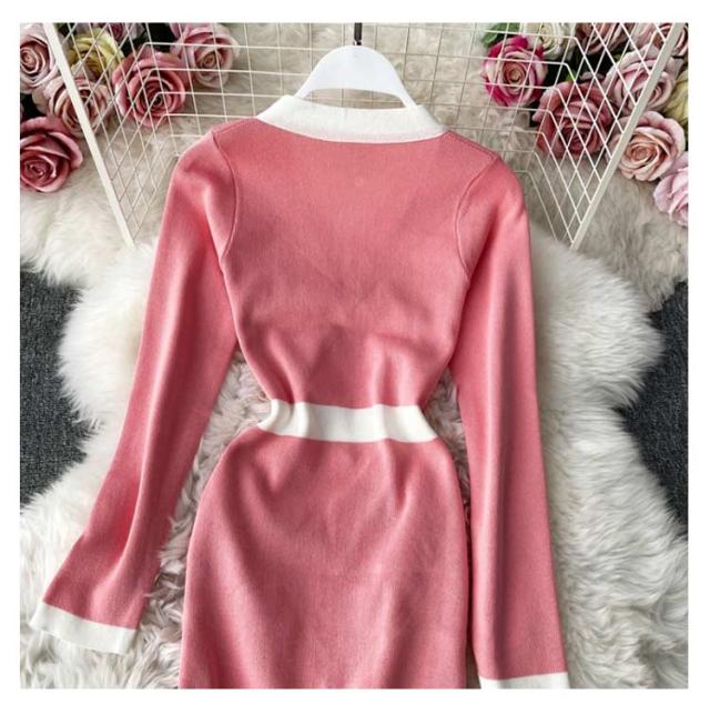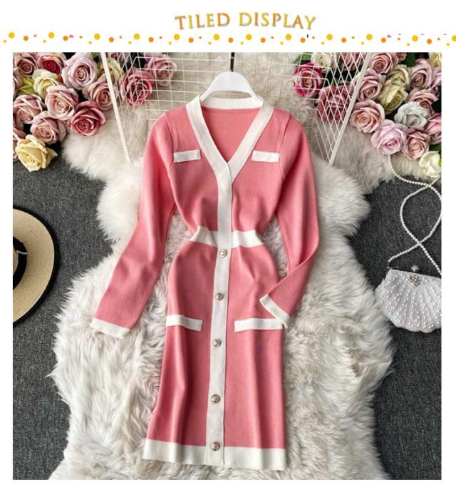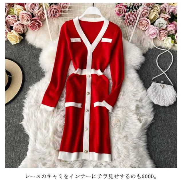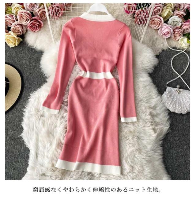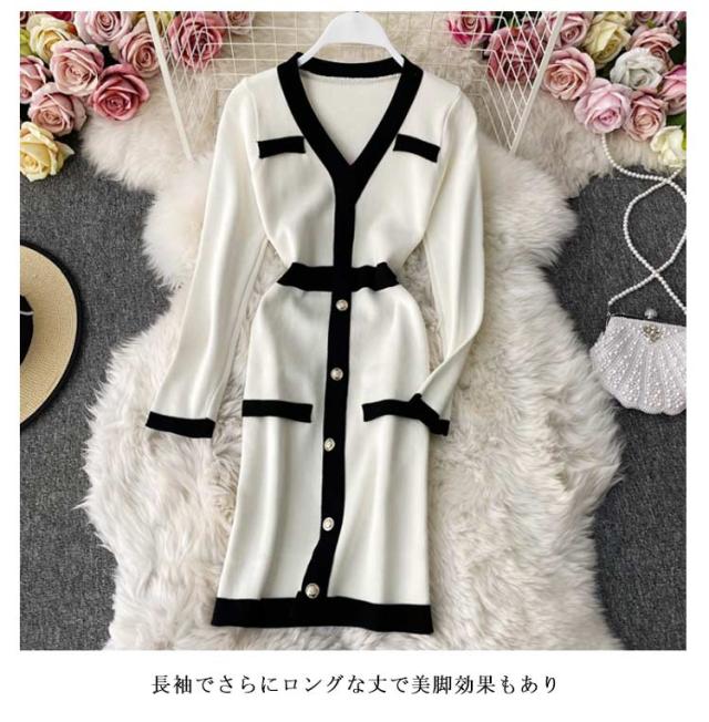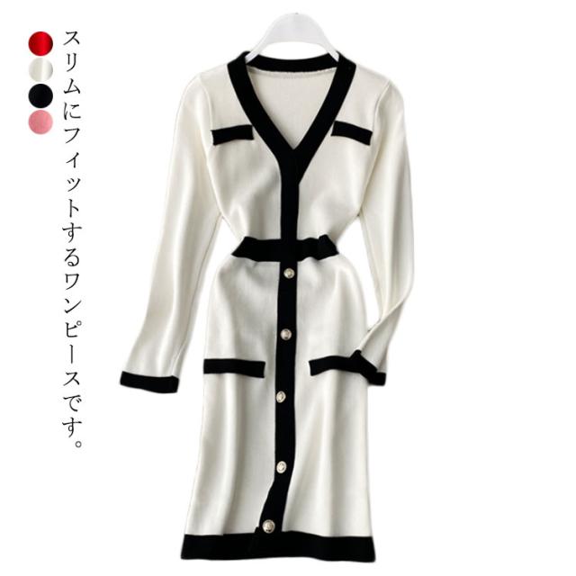 タイトリブワンピース ロングワンピース Vネック 黒 ブラック 長袖 ニットワンピース ロング タイト ひざたけ 膝丈 秋冬 春秋 リブニット セクシー タイトワンピース 送料無料