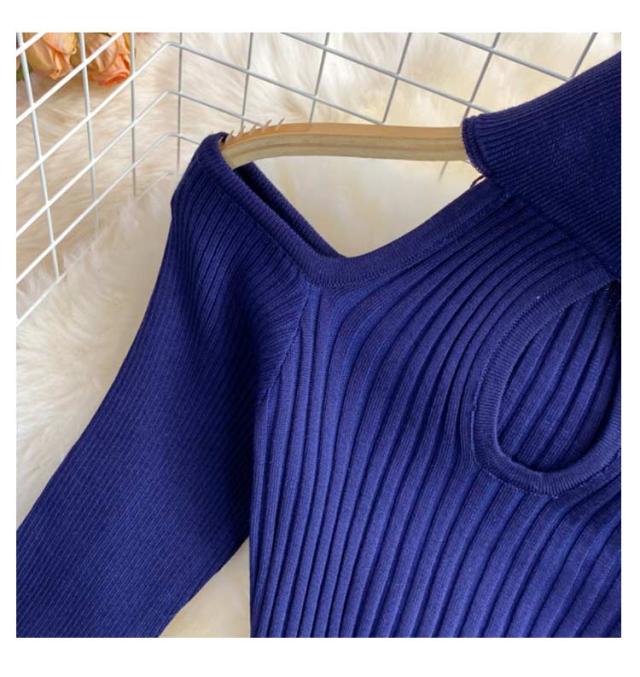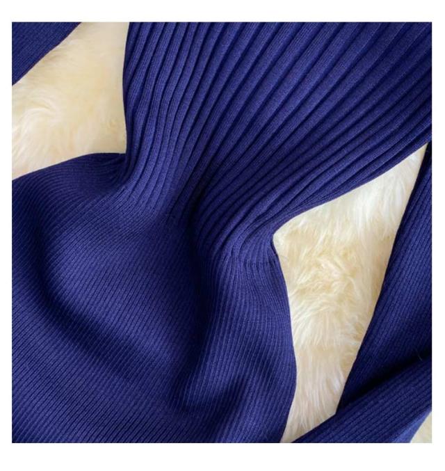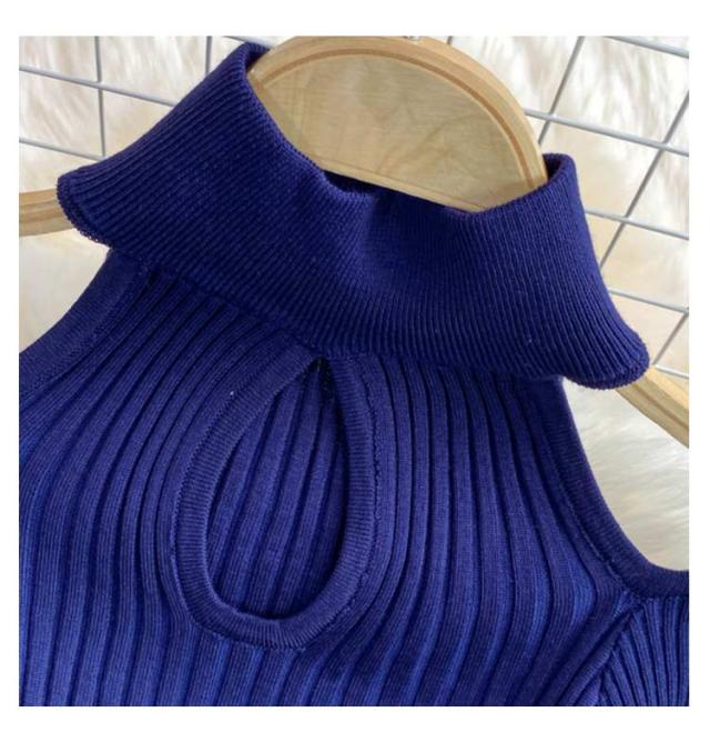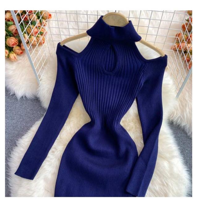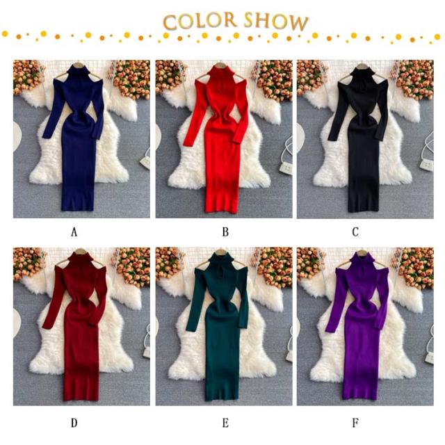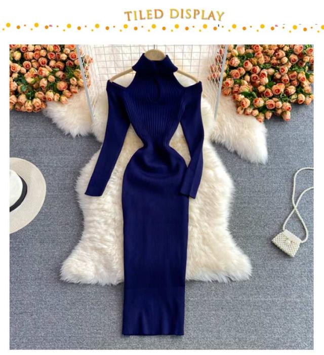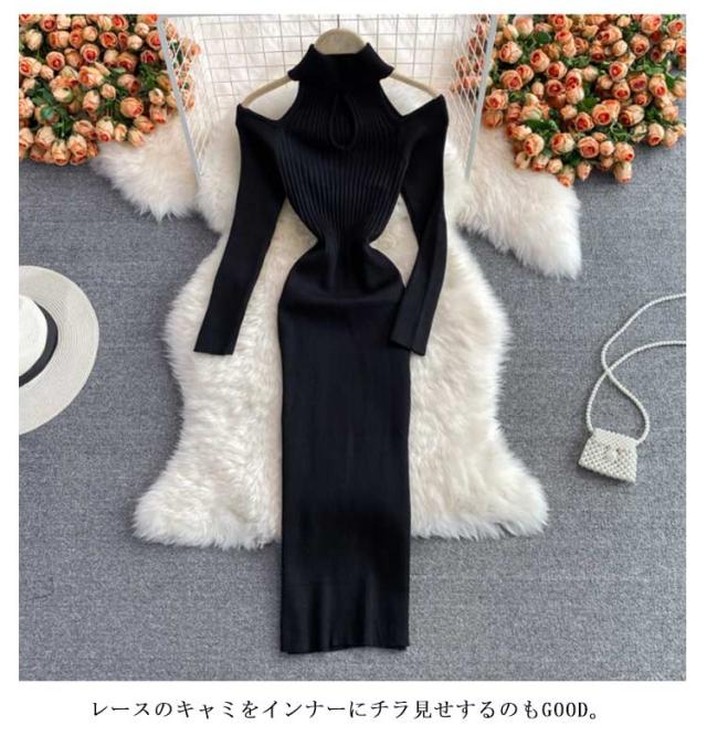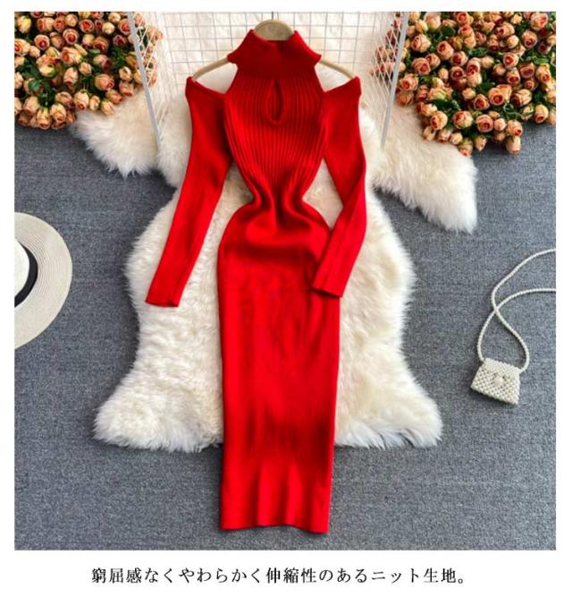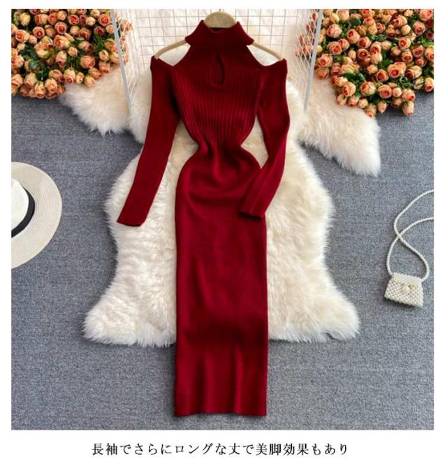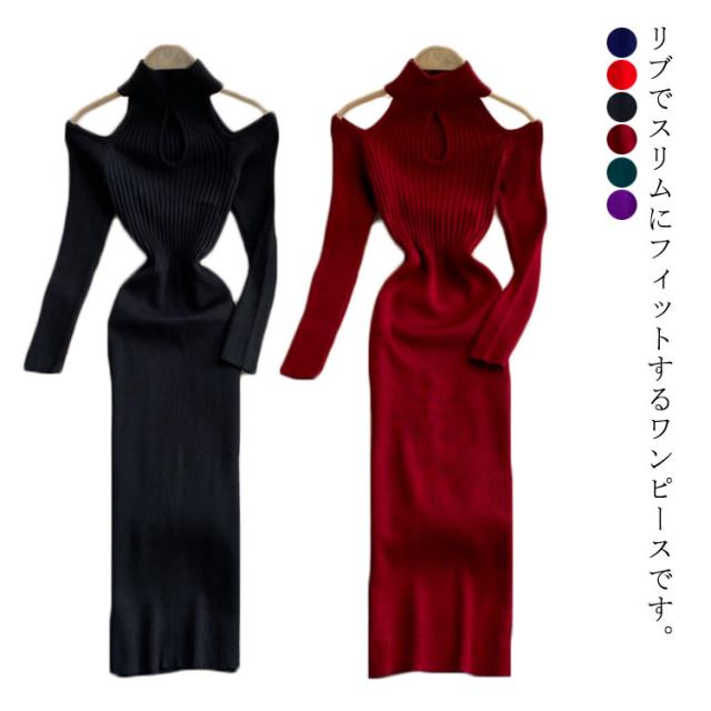 タイトリブワンピース ロングワンピース ランドネック ハイネック タートルネック 長袖 ニットワンピース オープンショルダー ロング タイト ひざたけ 膝丈 秋冬 春秋 リブニット セクシー タイトワンピース 送料無料
