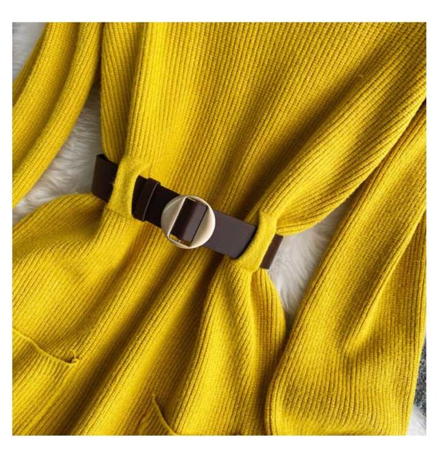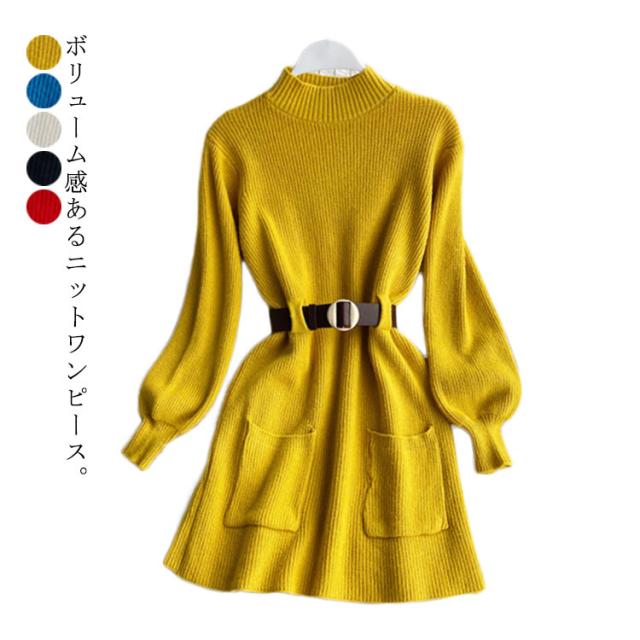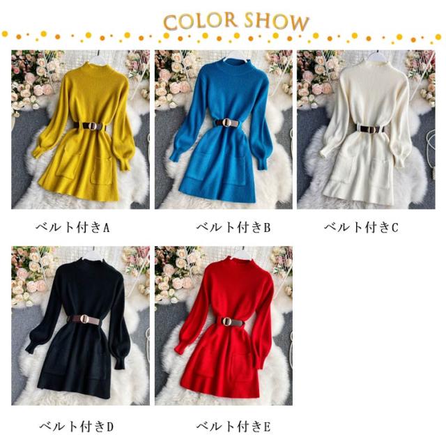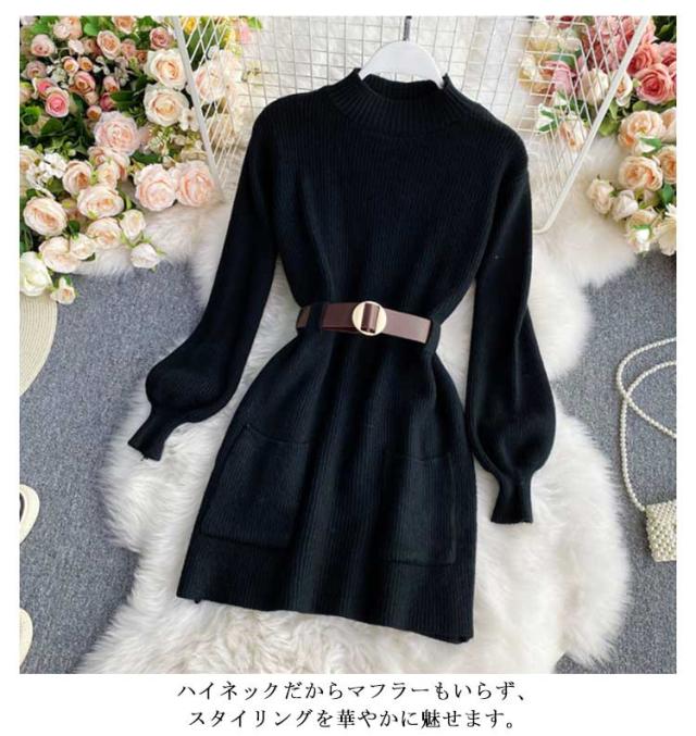 ベルト付きニットワンピース ロングワンピース フレアワンピース Aラインワンピ タートルネック 黒 ブラック 長袖 ニットワンピ ロング ひざたけ 膝丈 秋冬 春秋 リブニット 送料無料