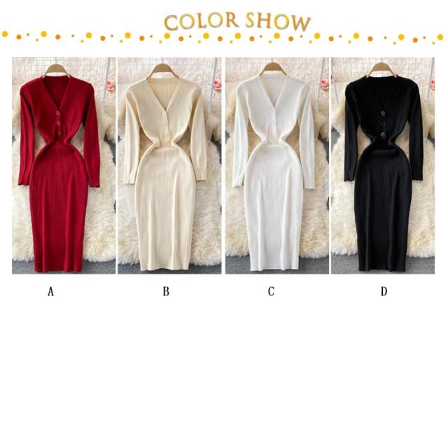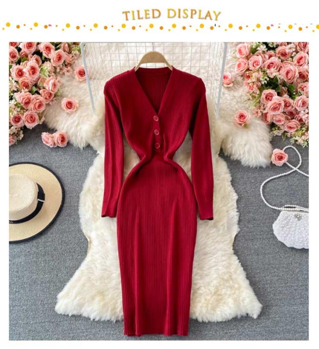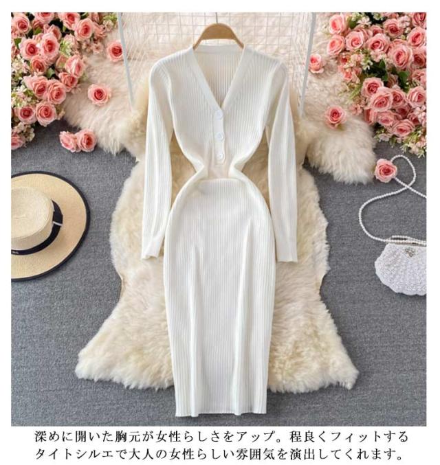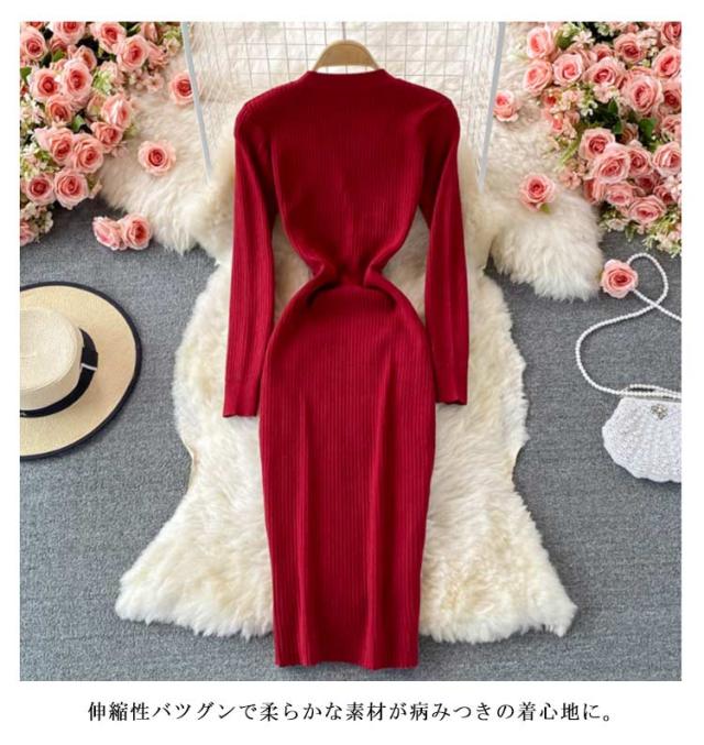タイトニットワンピース タイトニット タイトワンピース ロングニットワンピース Vネック 長袖 リブ ニットワンピース ロング丈 タイト ひざたけ 膝丈 秋冬 春秋 ニット 無地 シンプル