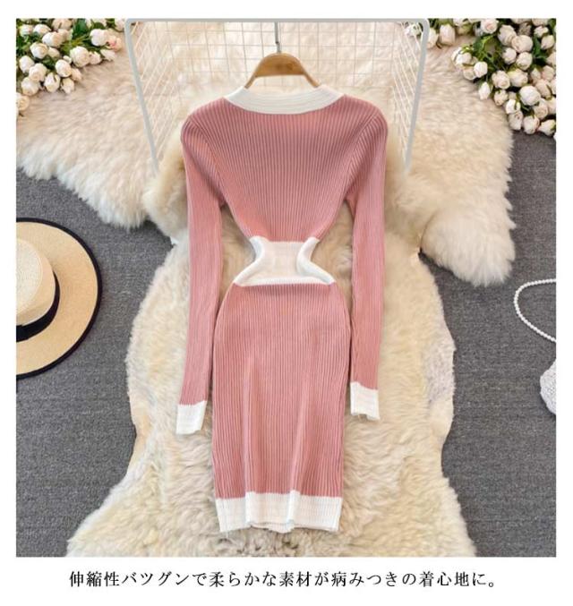 タイトニットワンピース タイトニット タイトワンピース ロングニットワンピース Vネック 長袖 リブ ニットワンピース ロング丈 タイト ひざたけ 膝丈 秋冬 春秋 ニット 無地 シンプル