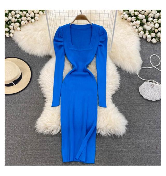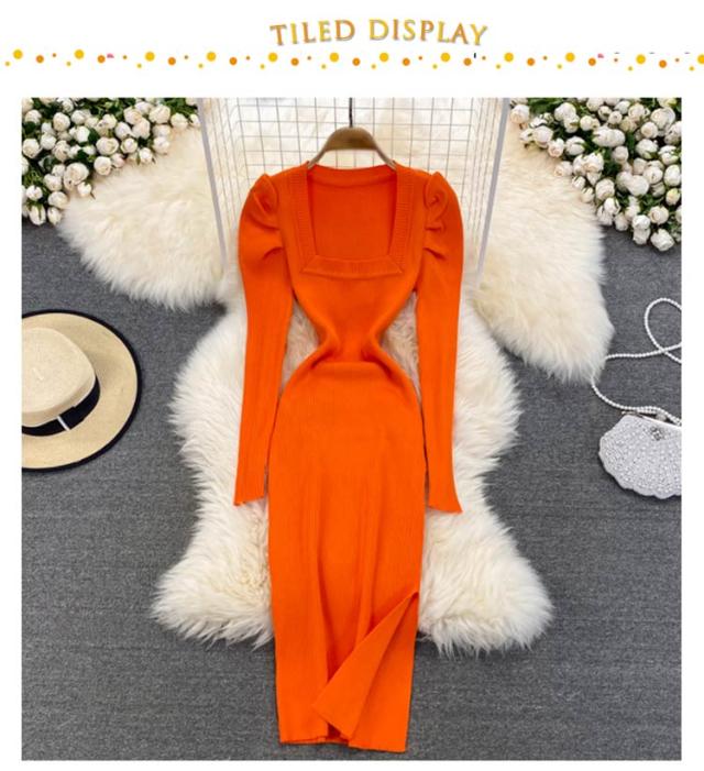 タイトニットワンピース タイトニット タイトワンピース ロングニットワンピース スリット スクェアネック 長袖 ニットワンピース ロング丈 タイト ひざたけ 膝丈 秋冬 春秋 ニット 無地 シンプル