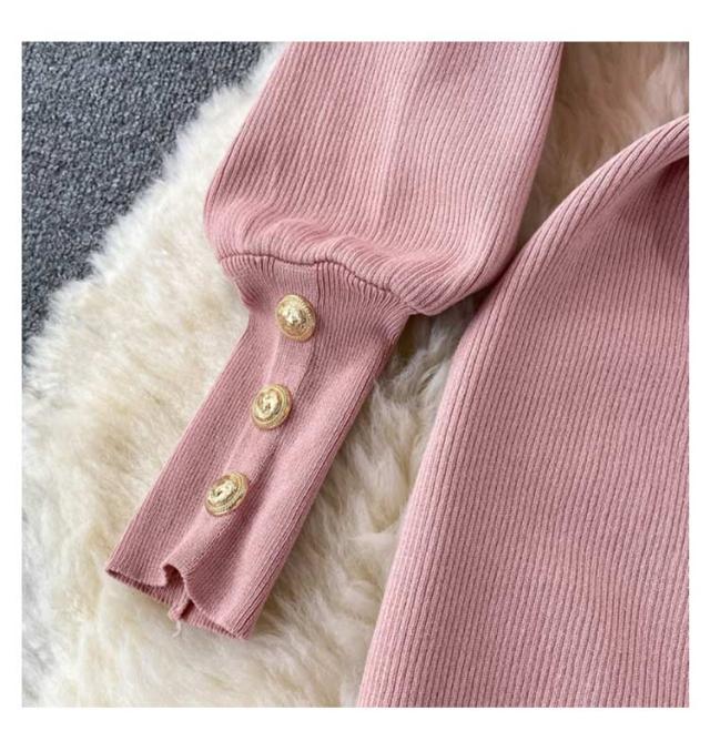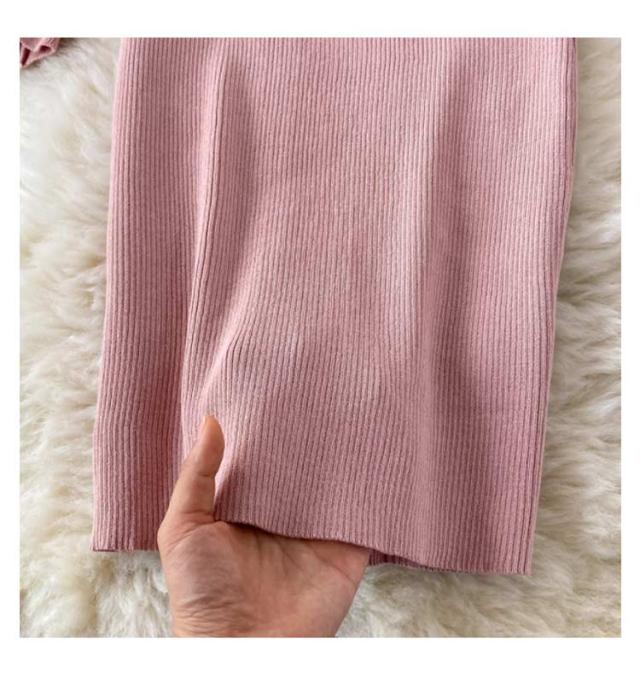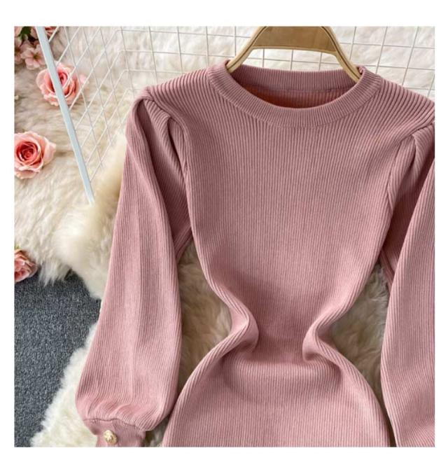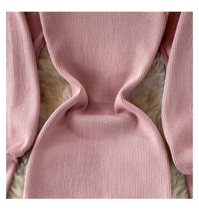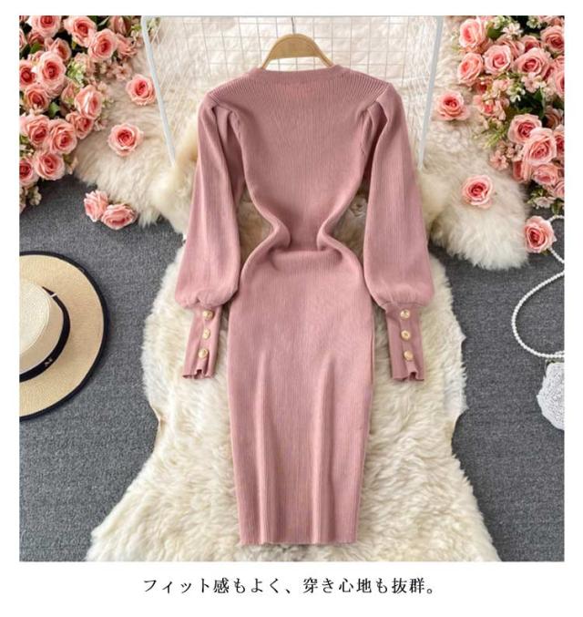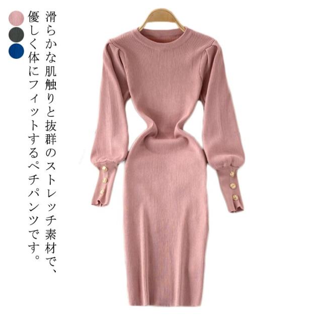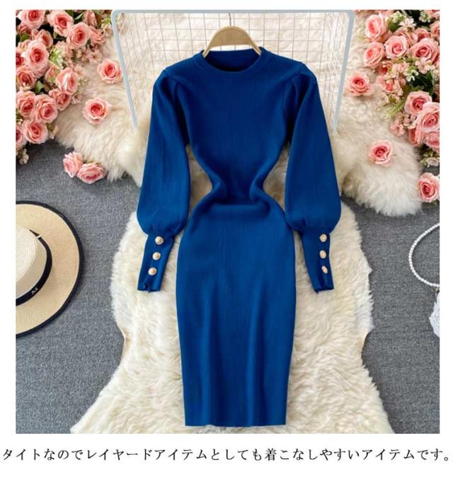 タイトニットワンピース タイトニット パフスリーブ タイトワンピース ロングニットワンピース ランドネック 長袖 リブ ニットワンピース ロング丈 タイト ひざたけ 膝丈 秋冬 春秋 ニット 無地 切替 シンプル