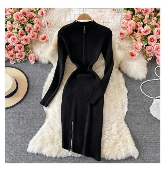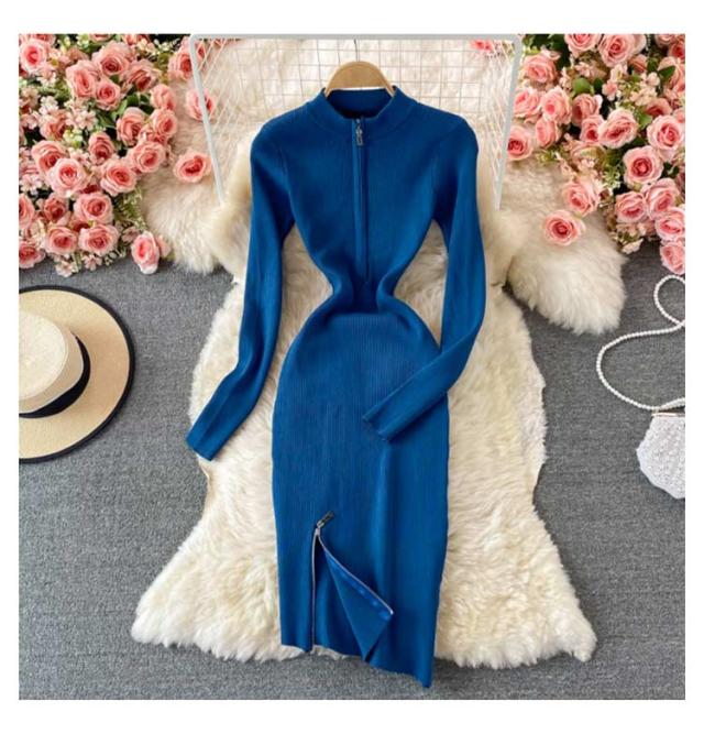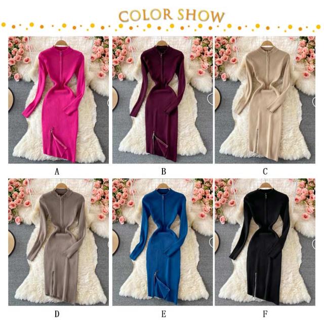 タイトニットワンピース タイトニット タイトワンピース ロングニットワンピース ハイネック スリット 長袖 リブ ニットワンピース ロング丈 タイト ひざたけ 膝丈 秋冬 春秋 ニット 無地 切替 シンプル