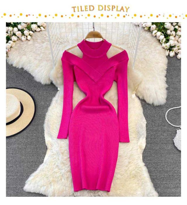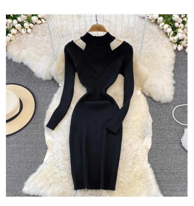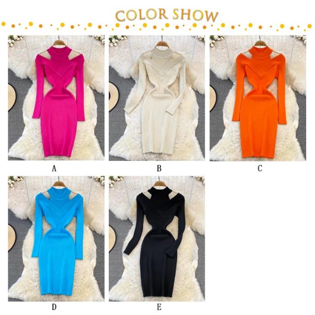 タイトニットワンピース タイトニット タイトワンピース ロングニットワンピース ハイネック スリット 長袖 リブ ニットワンピース ロング丈 タイト ひざたけ 膝丈 秋冬 春秋 ニット 無地 切替 シンプル