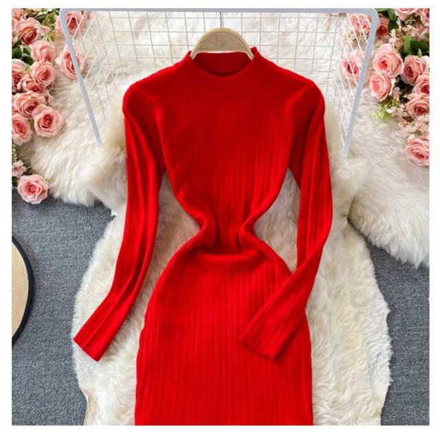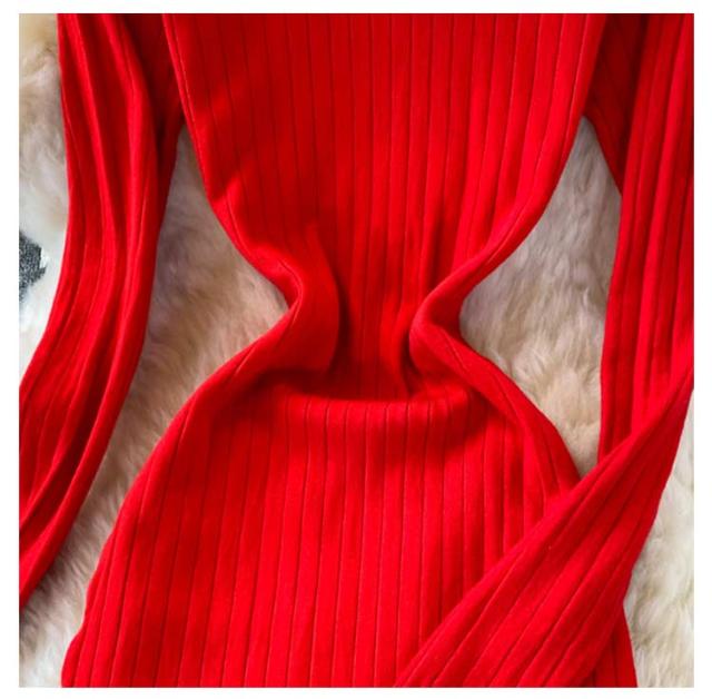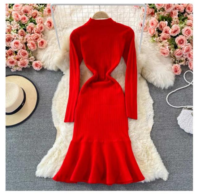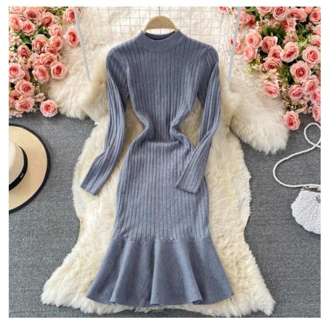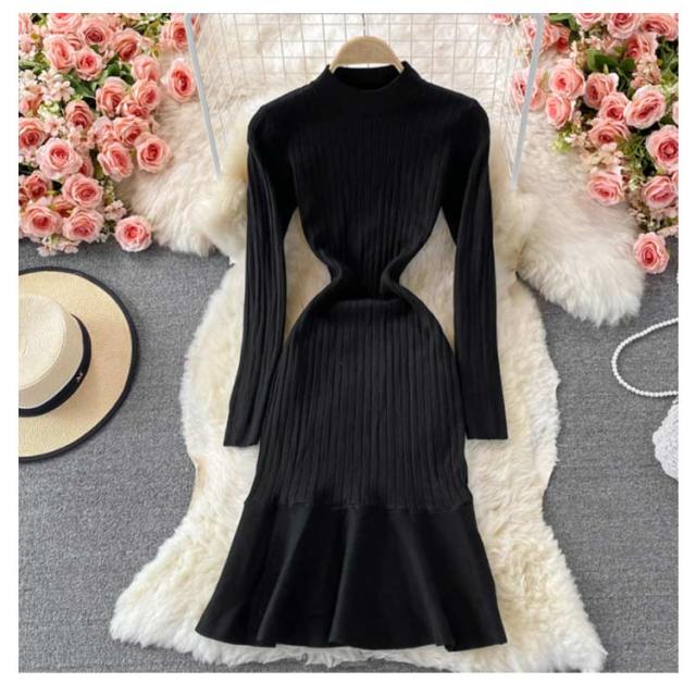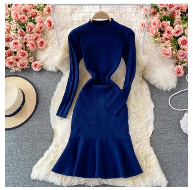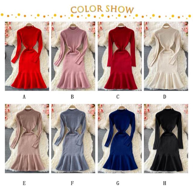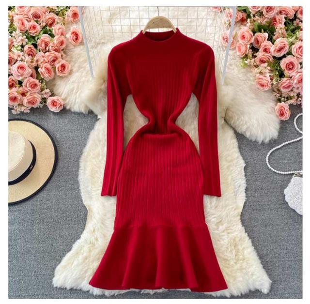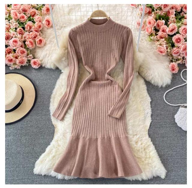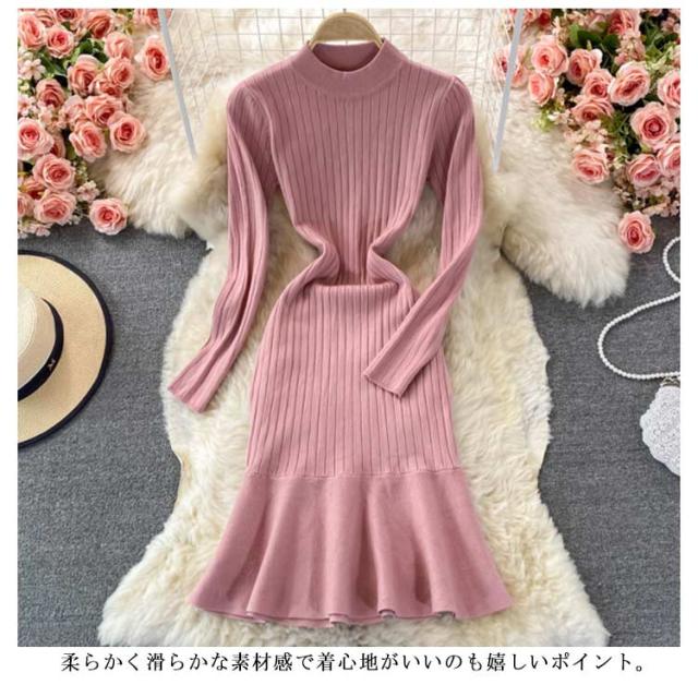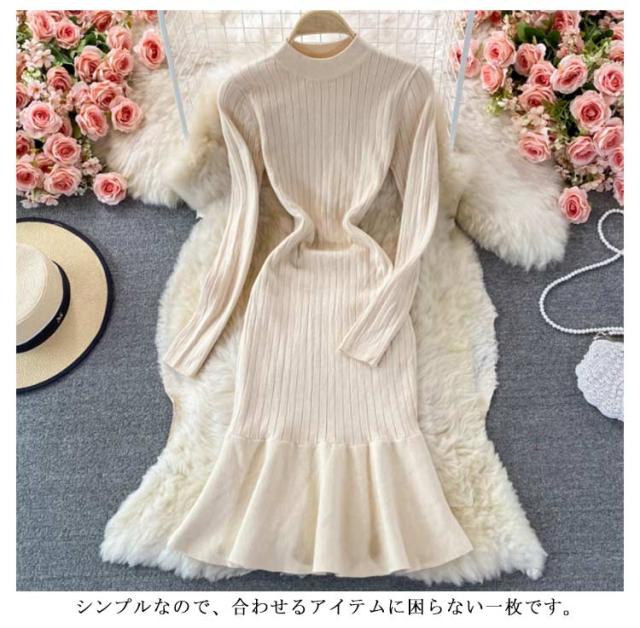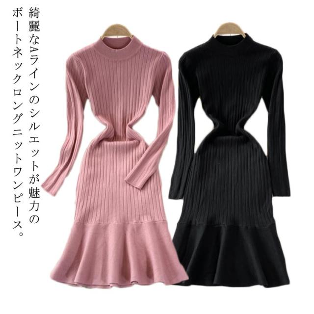 ワンピース ニット 長袖 ニットワンピ マーメイドワンピース 送料無料 無地 ハイネック ランドトネック 春 秋 冬 ロング丈 ミモレ丈 ニット フレアワンピース エレガント シンプル
