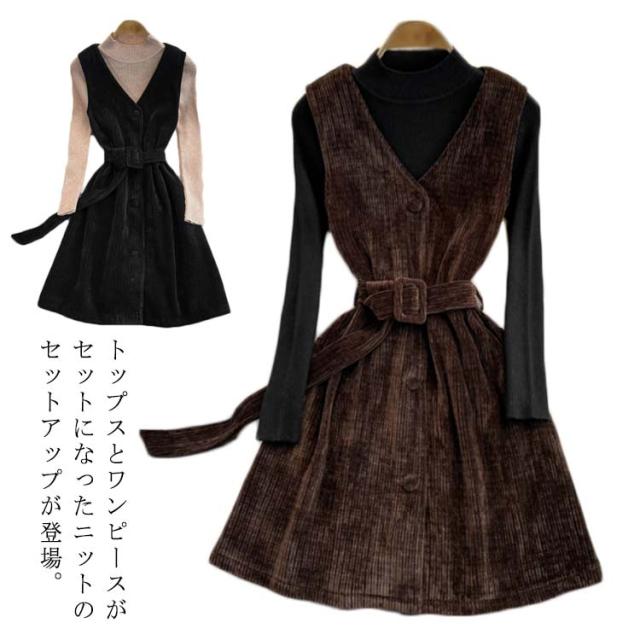 送料無料 ニット セットアップ レディース コーデュロイ ワンピース ニットトップス 2点セット ニット コーデュロイワンピース リブニット 無地 シンプル 上品 通勤 普段着 お洒落 謝恩会 披露宴 同窓会 女子会 結婚式